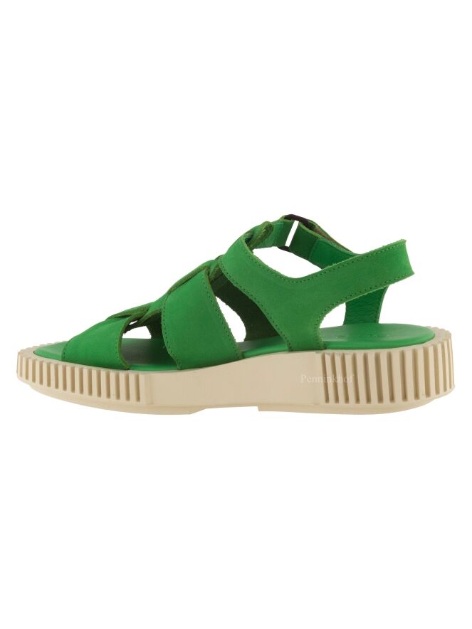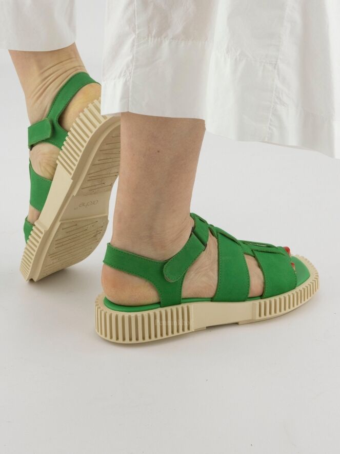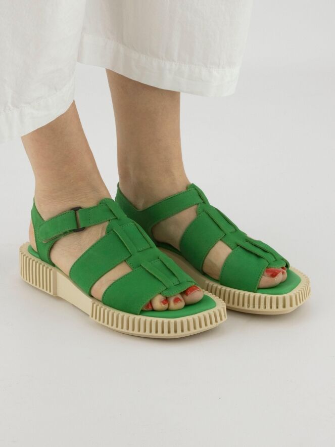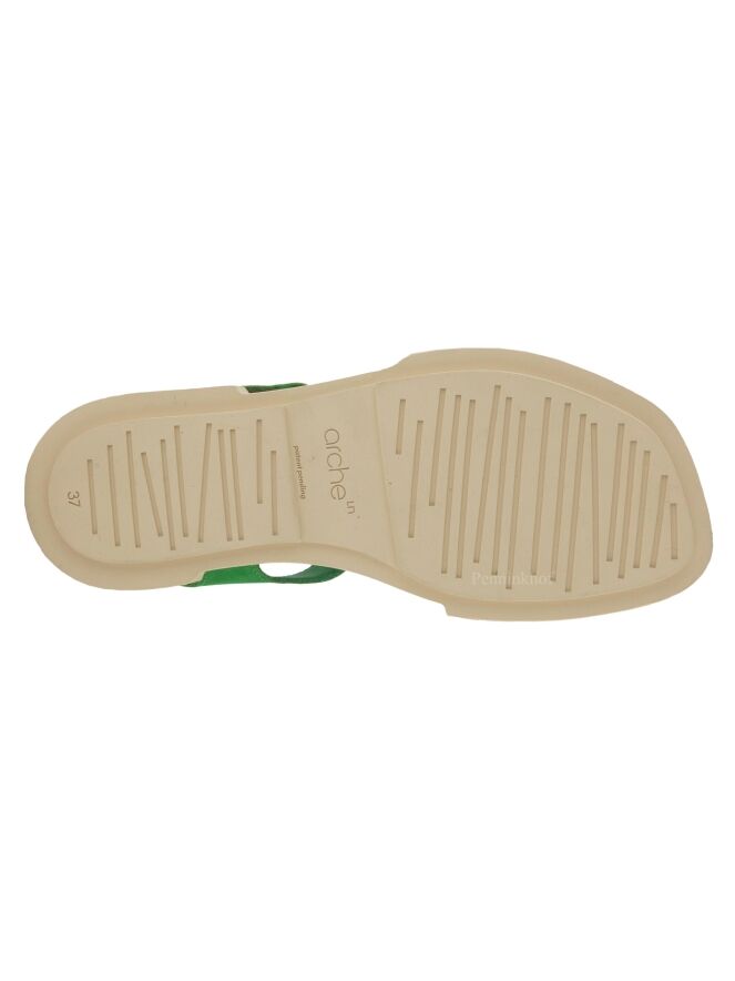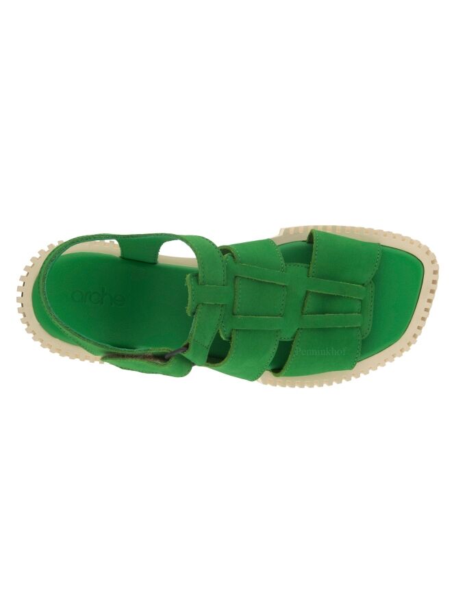 Sandale ouverte de la marque Arche, en nubuck couleur verte. La semelle blanc crème est nervurée en lignes droites. La fermeture autour du pied est réglable par velcro.