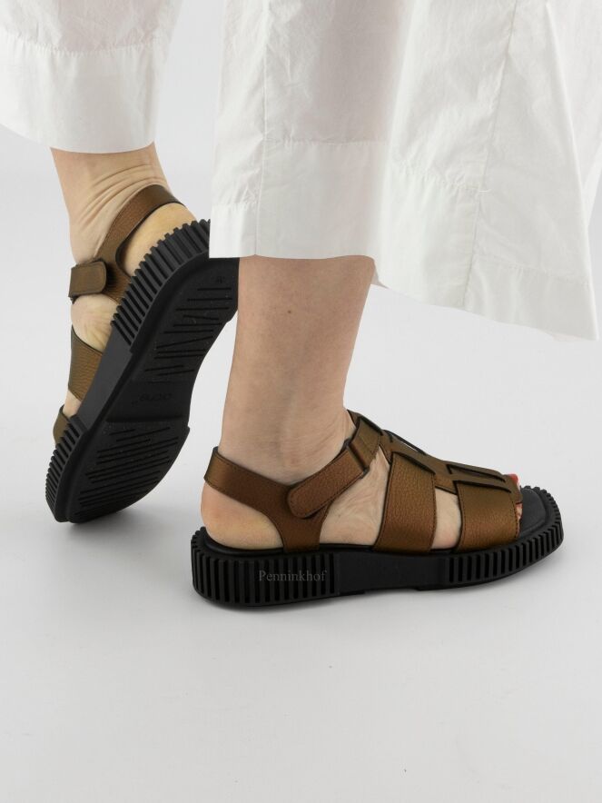 Sandale ouverte de la marque Arche, en cuir couleur bronze métallisé. La semelle noire est nervurée en lignes droites. La fermeture autour du pied est réglable par velcro.
