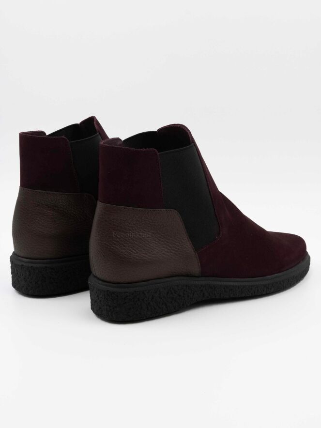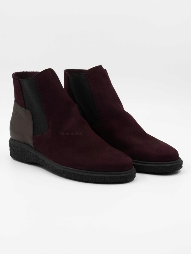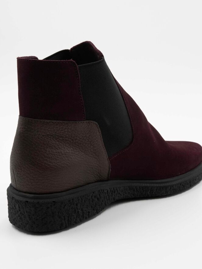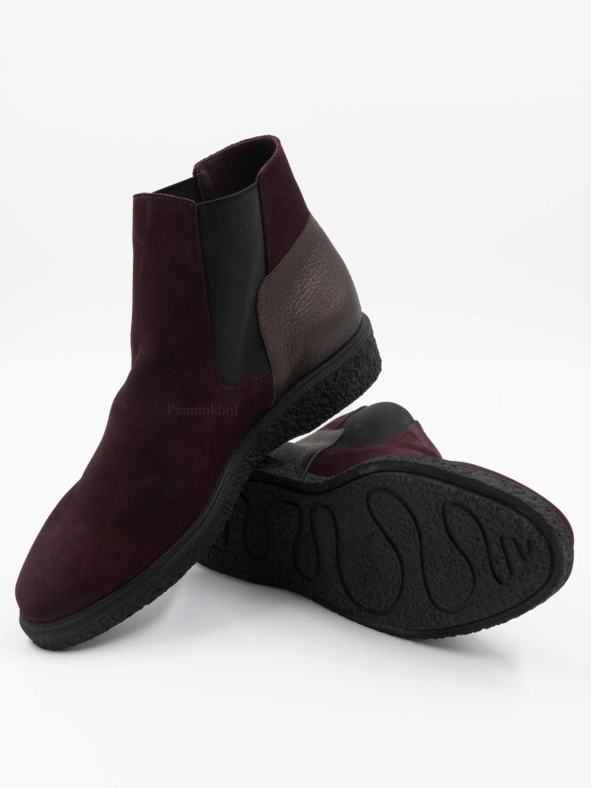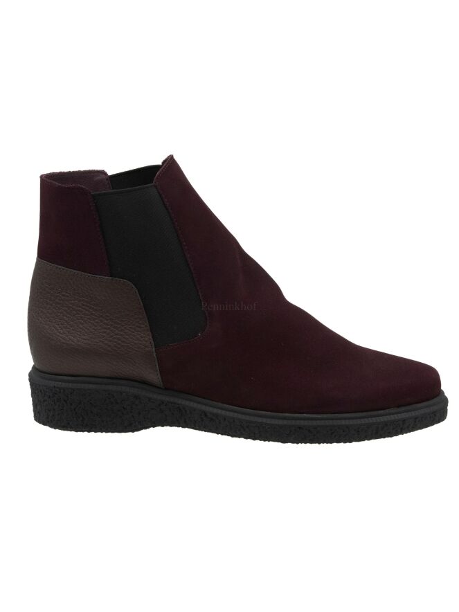 Une bottine courte de Arche en couleur bordeaux. Une pièce de tissu élastique est insérée de part et d'autre de la tige courte. Sur le talon se trouve une pièce de cuir bordeaux. La botte n'est pas doublée.