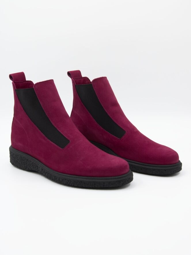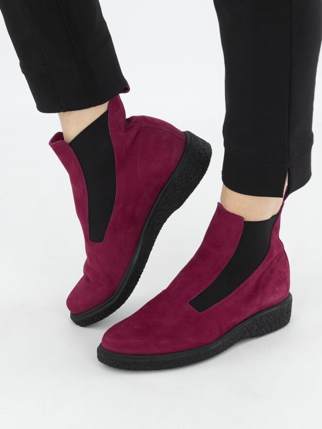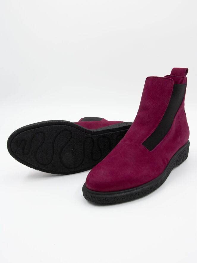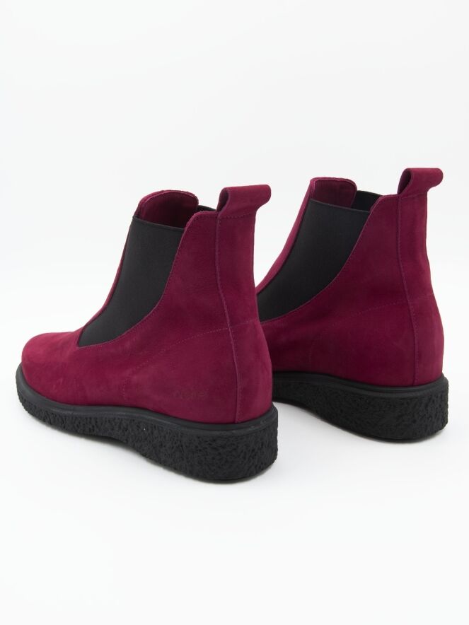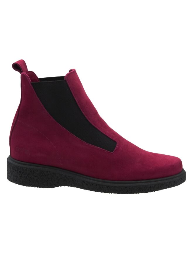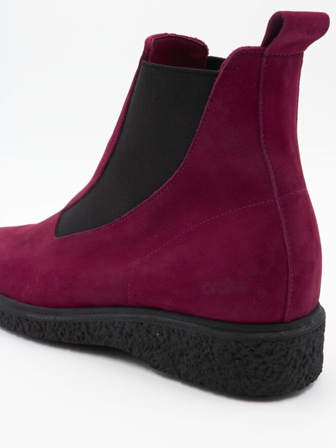 Une bottine d'Arche en couleur bordeaux doux. De chaque côté de l'avant-pied, il y a un tissu élastique qui épouse la forme de l'avant-pied jusqu'à la tige. L'intérieur n'est pas doublé.