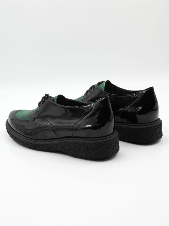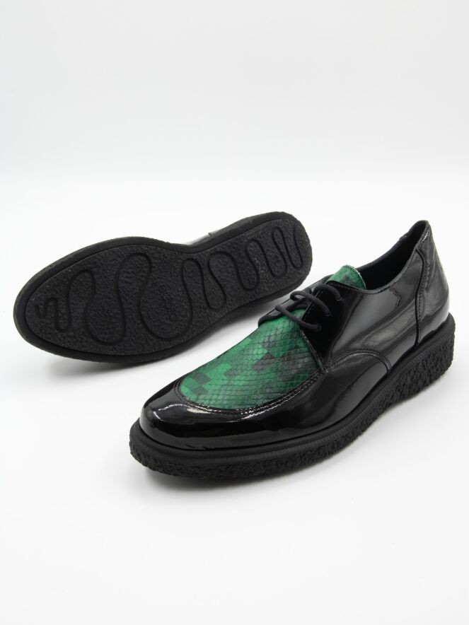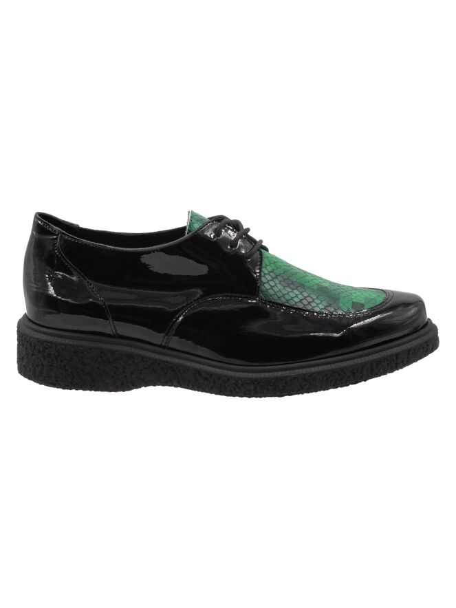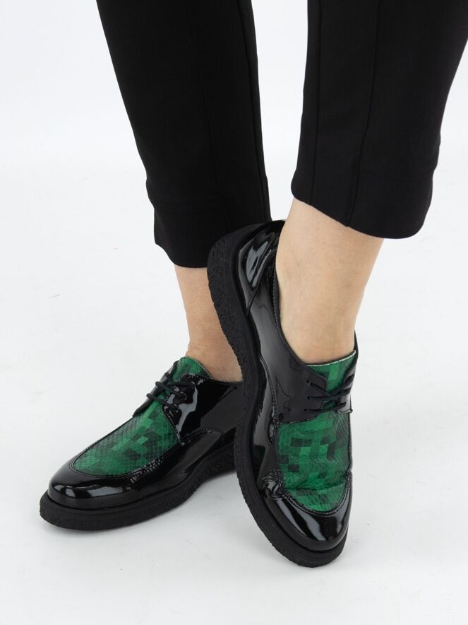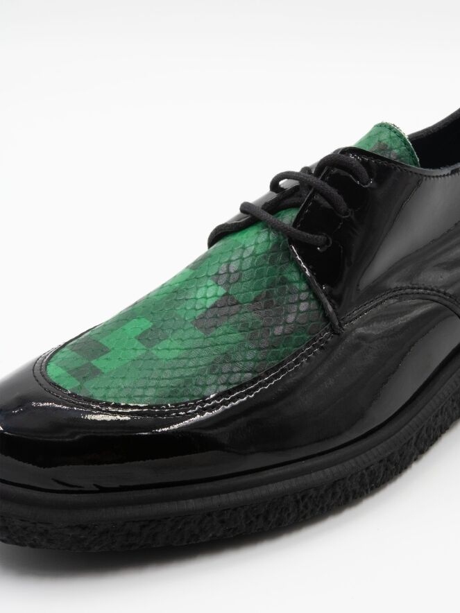 Une chaussure à lacets d'Arche en cuir verni vert foncé. L'avant-pied est en cuir avec une impression bloc présentant une structure de reptile en plusieurs nuances de vert. L'intérieur n'est pas doublé.