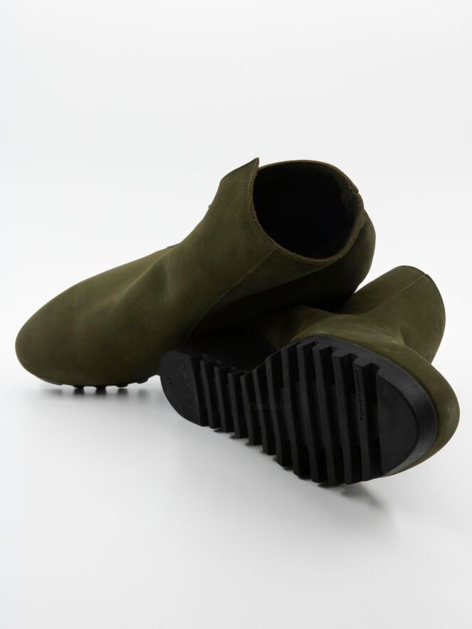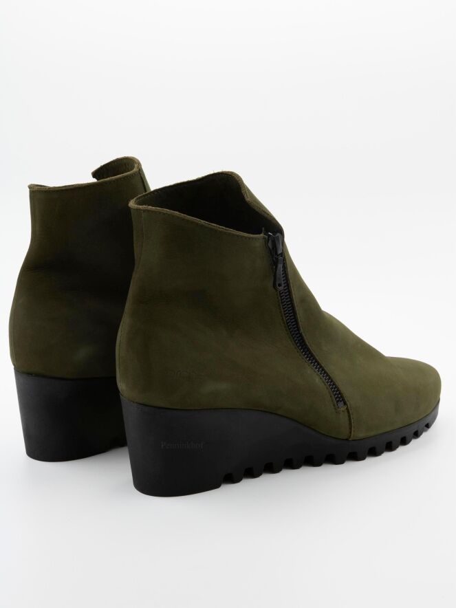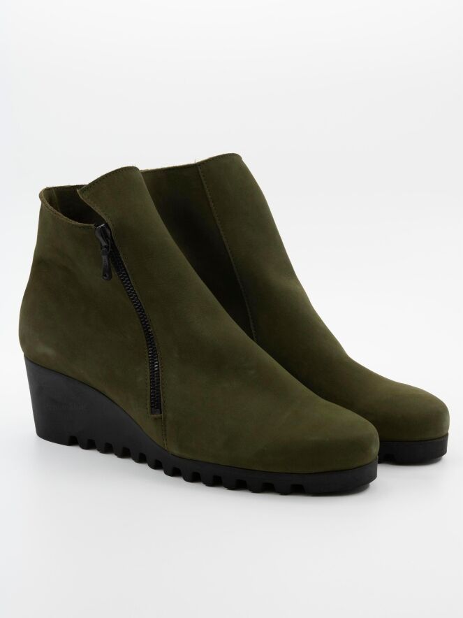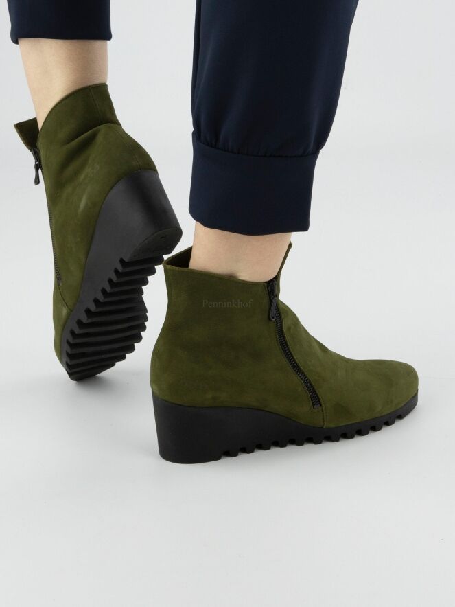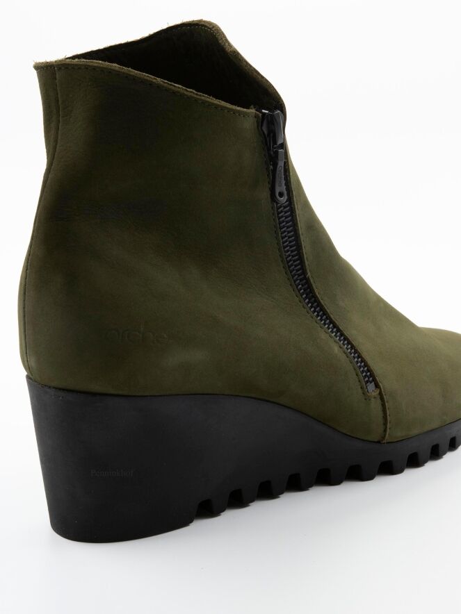 Une bottine Arche de couleur vert olive. A l'extérieur se trouve une fermeture éclair inclinée de couleur noire. La semelle moletée est de couleur noire. Le nez de la botte est rond et l'intérieur n'est pas doublé.