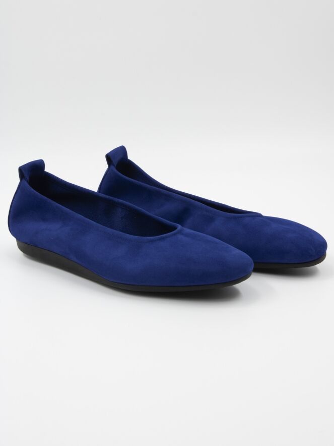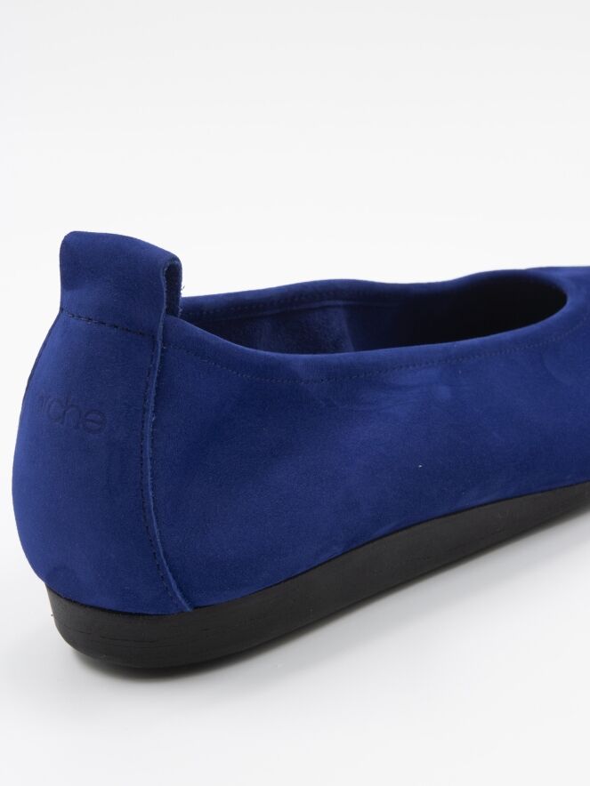 Le modèle "Laius" de la marque Arche en couleur bleu cobalt. Ces ballerines sont fabriquées en daim nubuck de haute qualité et sont dotées d'une semelle en latex. Le modèle est d'une couleur unie. L'embout des ballerines est joliment arrondi. L'intérieur des ballerines n'est pas doublé. La partie arrière de la semelle est légèrement surélevée, ce qui ajoute au confort.