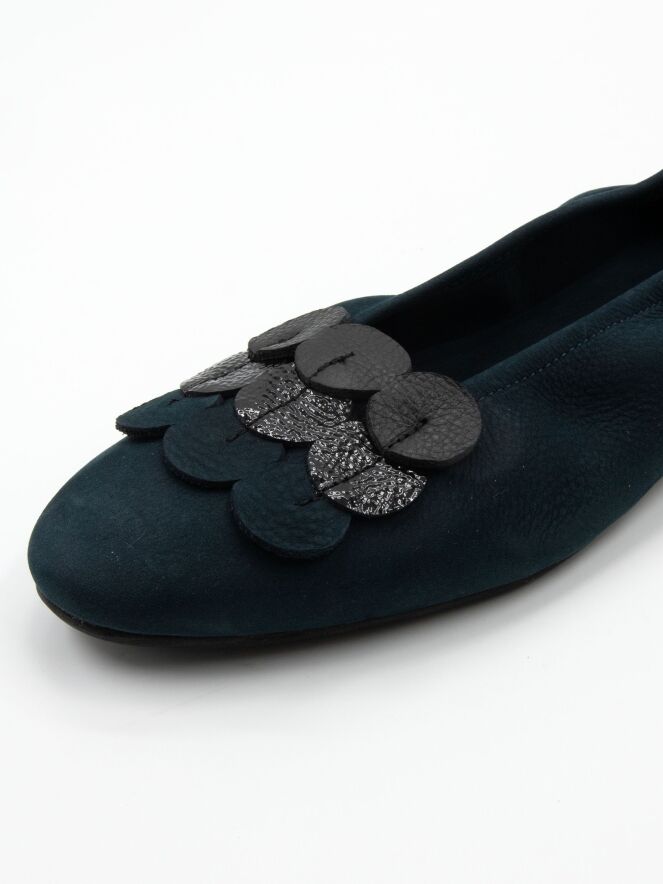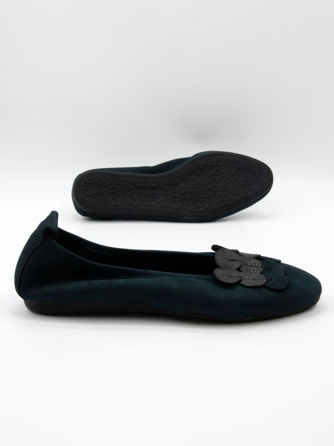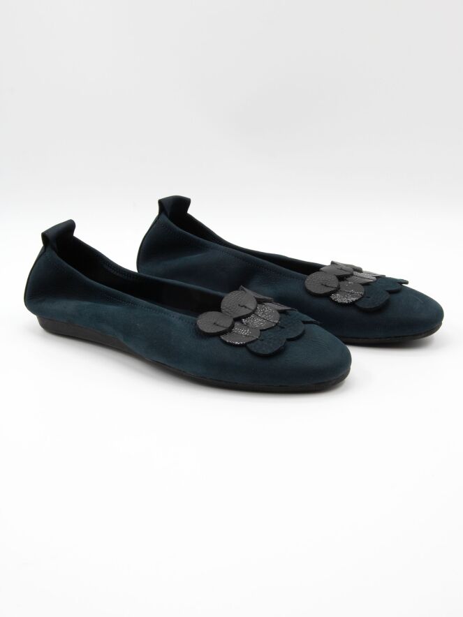 Ballerine de Arche, identique au modèle Laius, dans une élégante teinte bleu marine. L’avant du pied est orné de neuf éléments circulaires décoratifs (3x3) réalisés dans trois qualités de cuir différentes, créant un relief raffiné et original. Le bout élégamment arrondi souligne son allure intemporelle. L’intérieur non doublé garantit une souplesse accrue et un chaussant naturel, tandis que la partie arrière légèrement surélevée de la semelle apporte un confort supplémentaire à chaque pas.