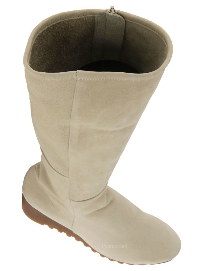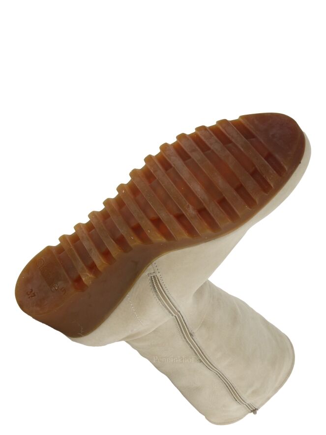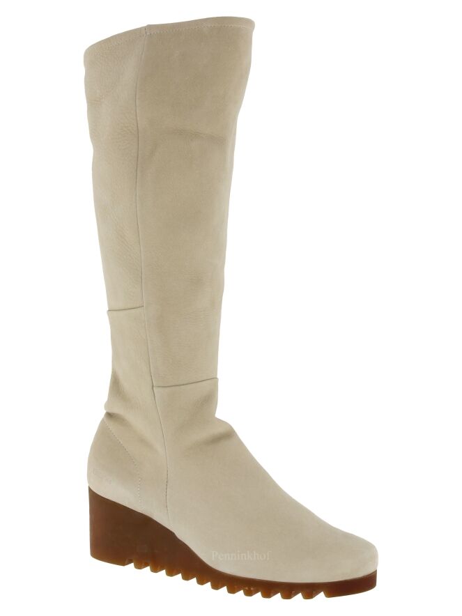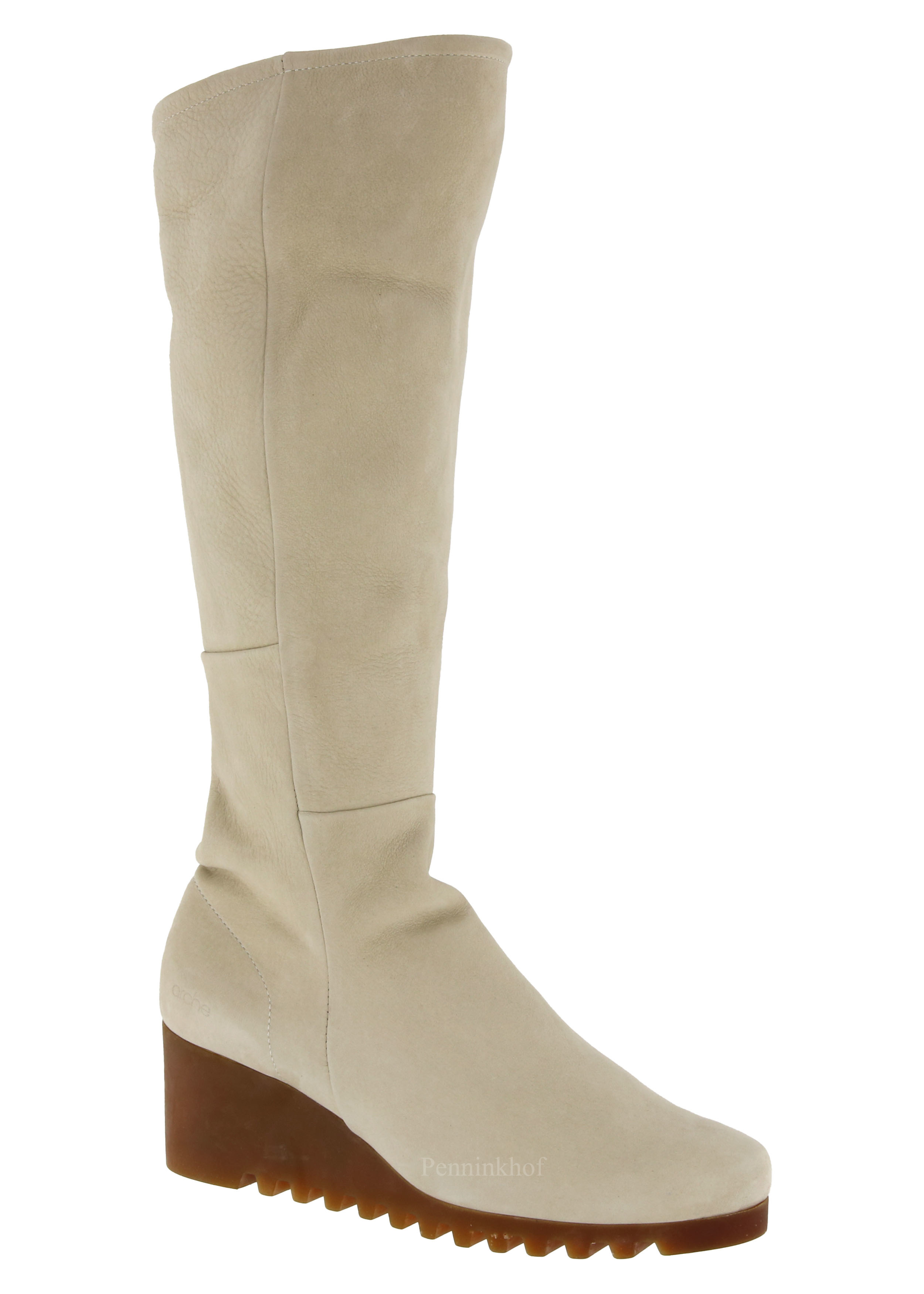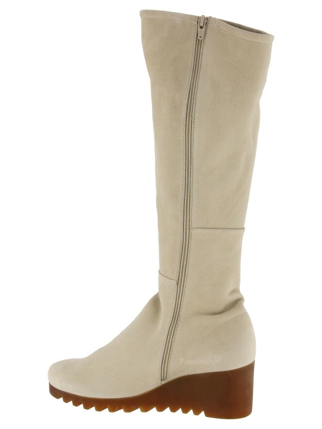 Botte haute de la marque Arche, en cuir de couleur écrue. La botte présente un talon compensé à semelle crantée en latex de couleur cognac. L'intérieur est équipé d'un zip noir de fermeture sur toute la hauteur. Intérieur non doublé.