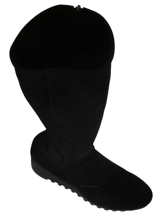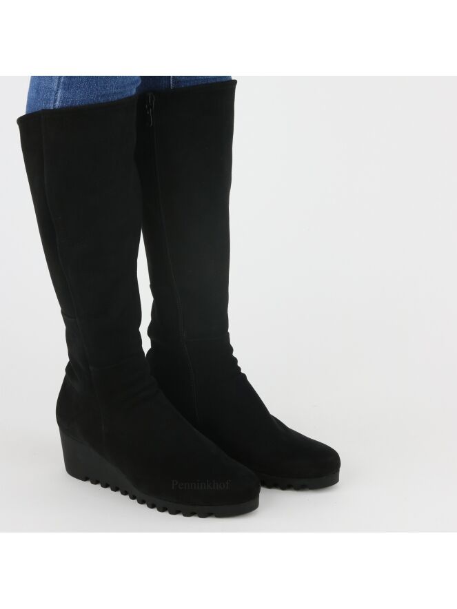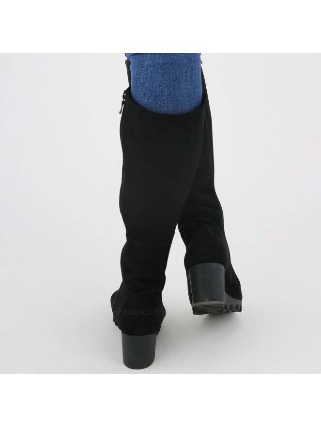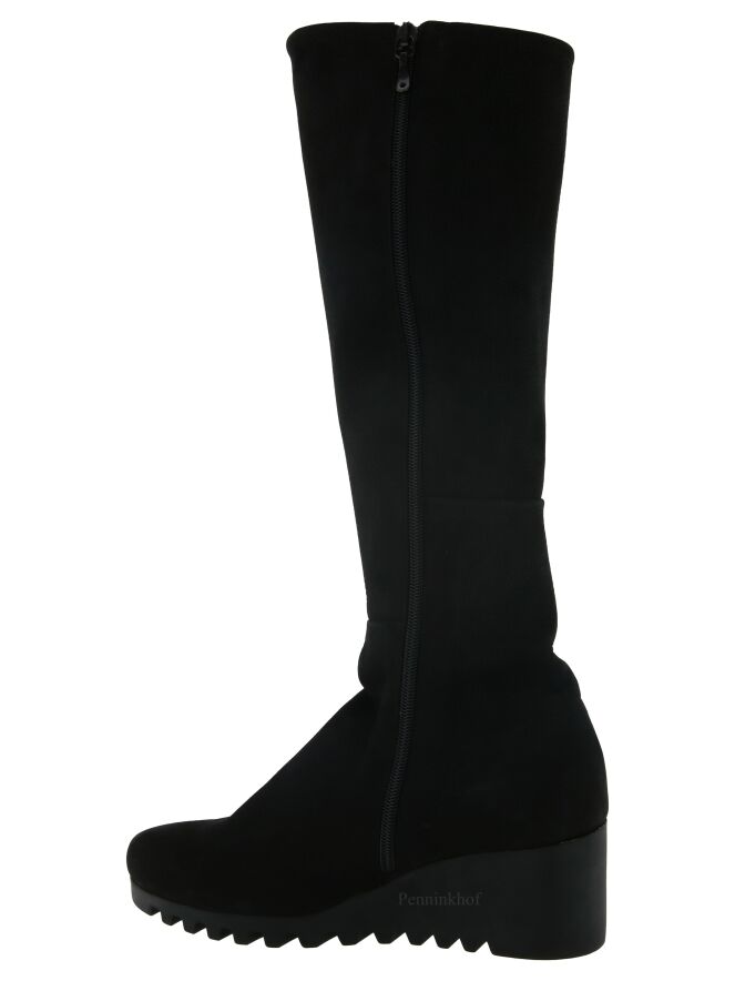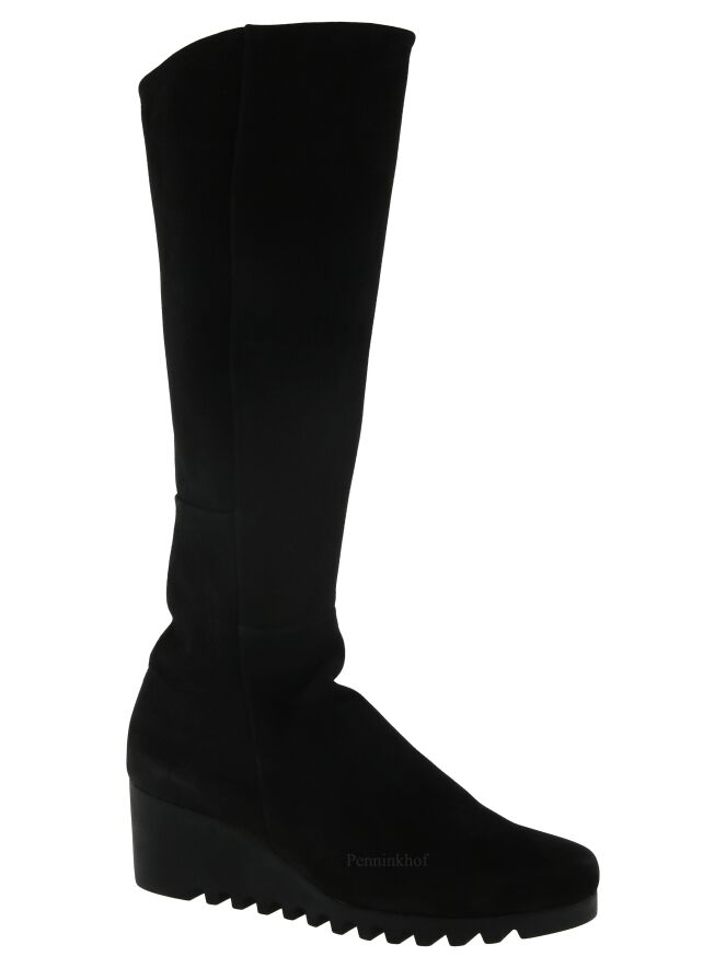Botte haute de la marque Arche, en cuir de couleur noire. La botte présente un talon compensé avec une semelle crantée en latex de la même couleur. L'intérieur est équipé d'un zip noir de fermeture sur toute la hauteur. Intérieur non doublé.