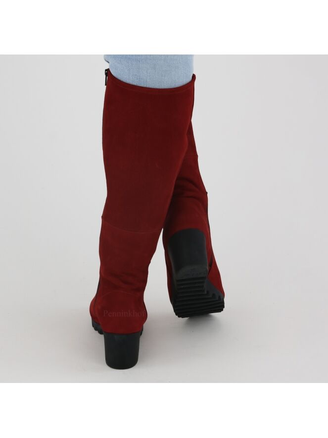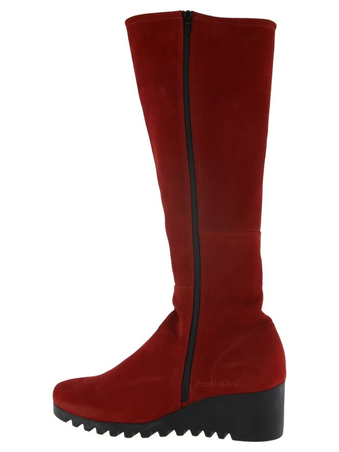 Botte haute de la marque Arche, en cuir de couleur rouge. La botte présente un talon compensé à semelle crantée en latex de couleur noire. L'intérieur est équipé d'un zip noir de fermeture sur toute la hauteur. Intérieur non doublé.