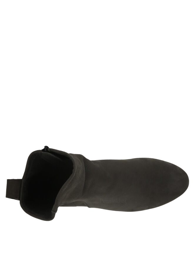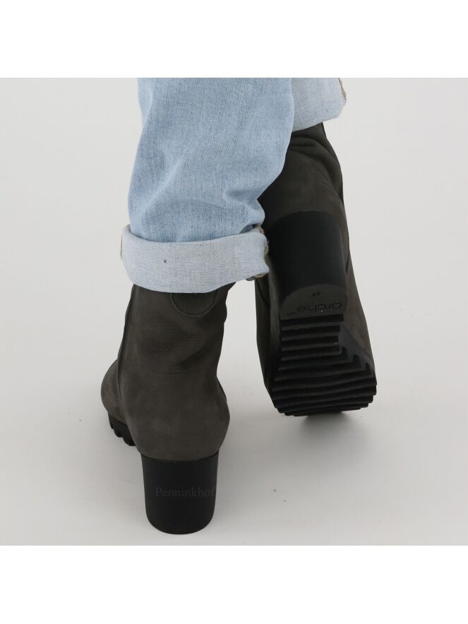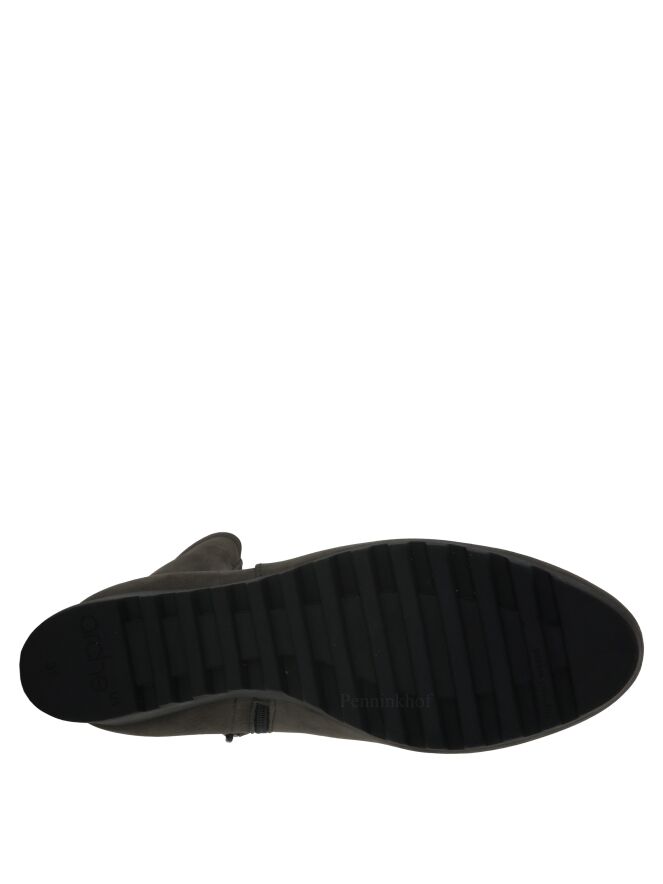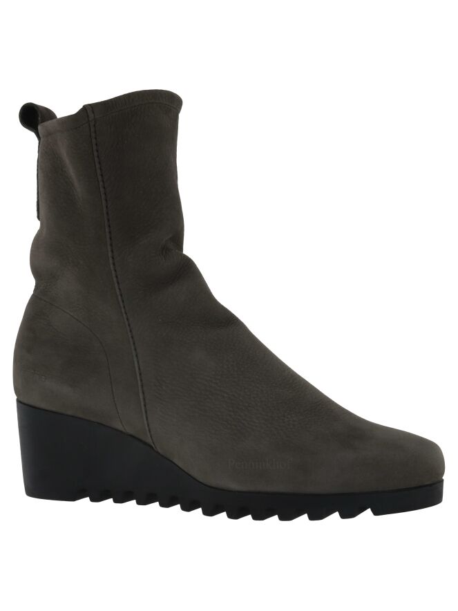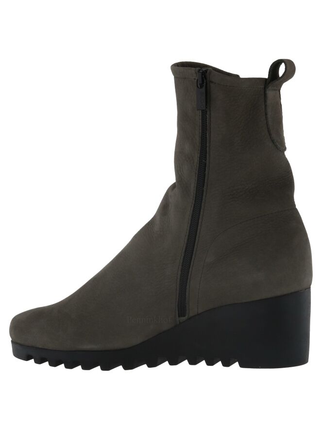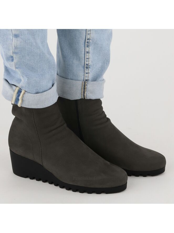 Bottine de la marque Arche, en cuir souple de couleur grise. Elle s'enfile grâce à sa fermeture Eclair sur le côté intérieur. La semelle est compensée avec un talon de 5 cm, crantée lui donnant un look sportif. Intérieur non doublé.