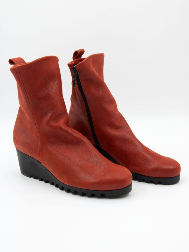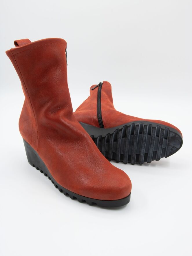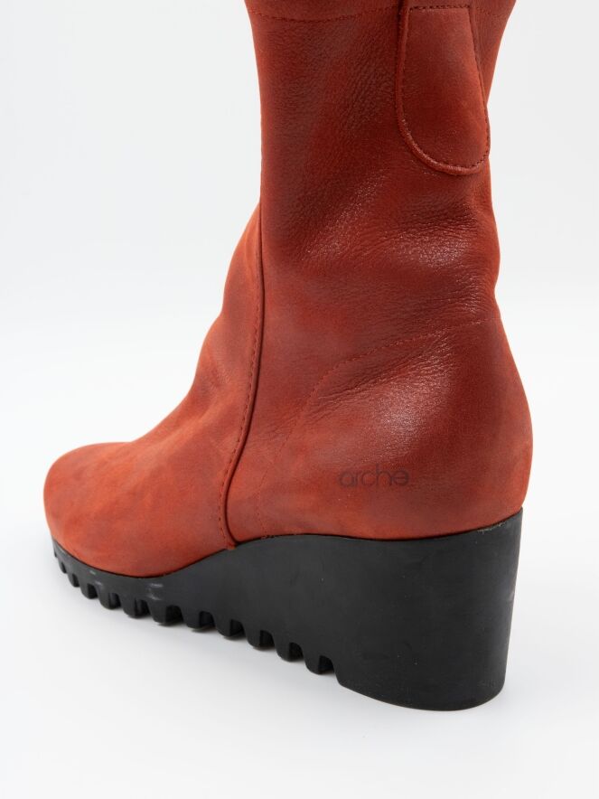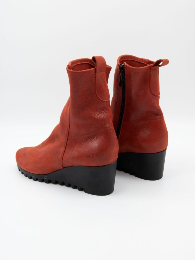 Une bottine sur un talon compensé de la marque Arche dans un coloris cognac flammé. La botte n'est pas doublée. La semelle est crantée sportive.