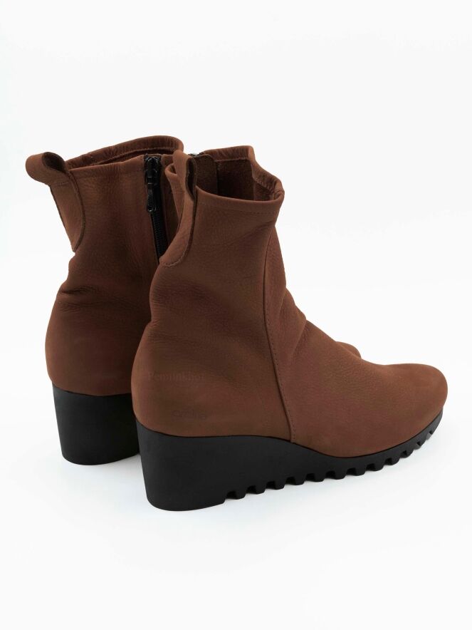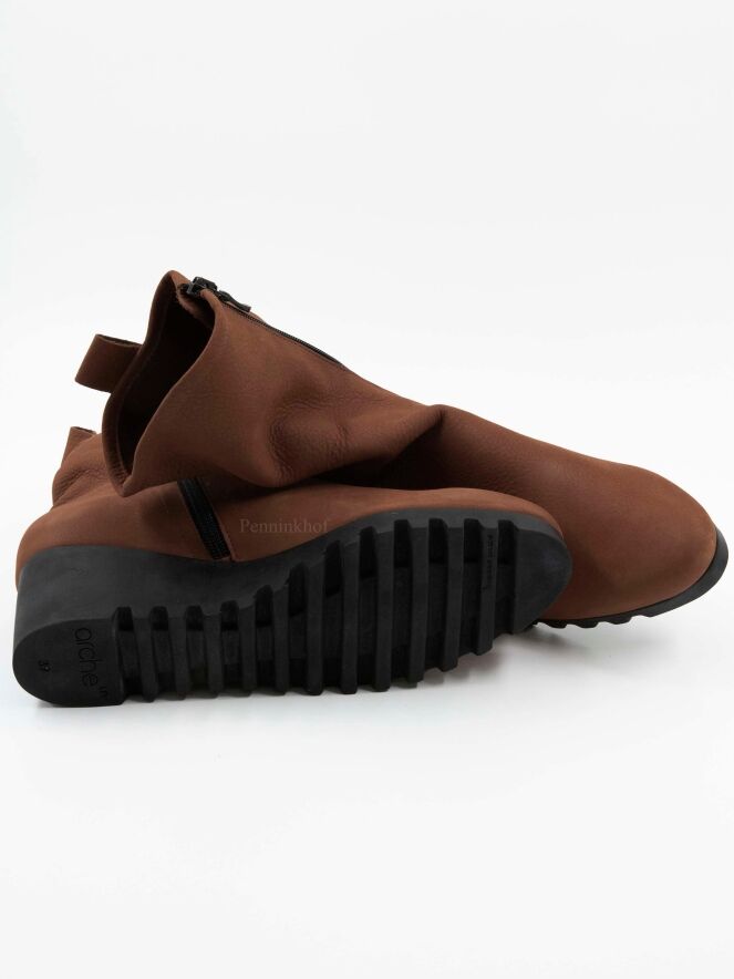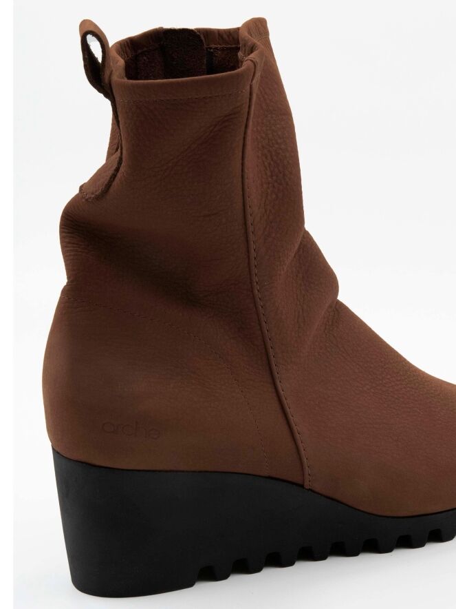 Bottine de la marque Arche, en nubuck marron. Elle s'enfile grâce à sa fermeture Eclair sur le côté intérieur. La semelle est compensée avec un talon de 5 cm, crantée lui donnant un look sportif. Intérieur non doublé.