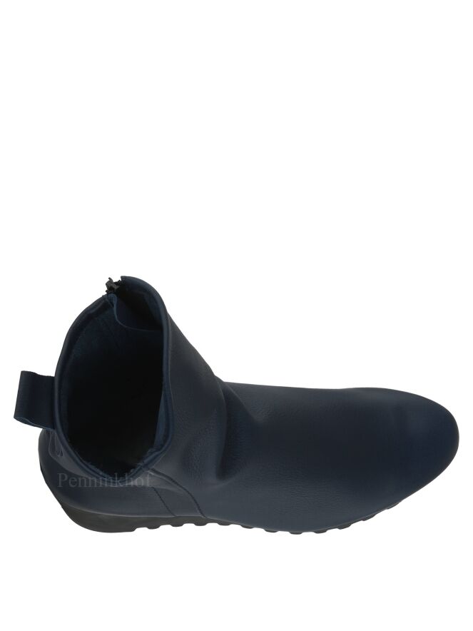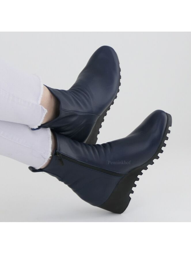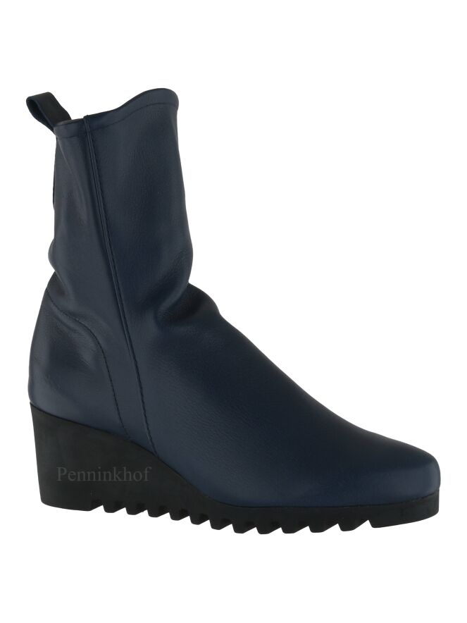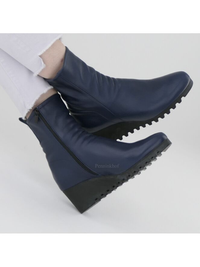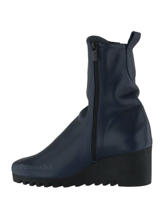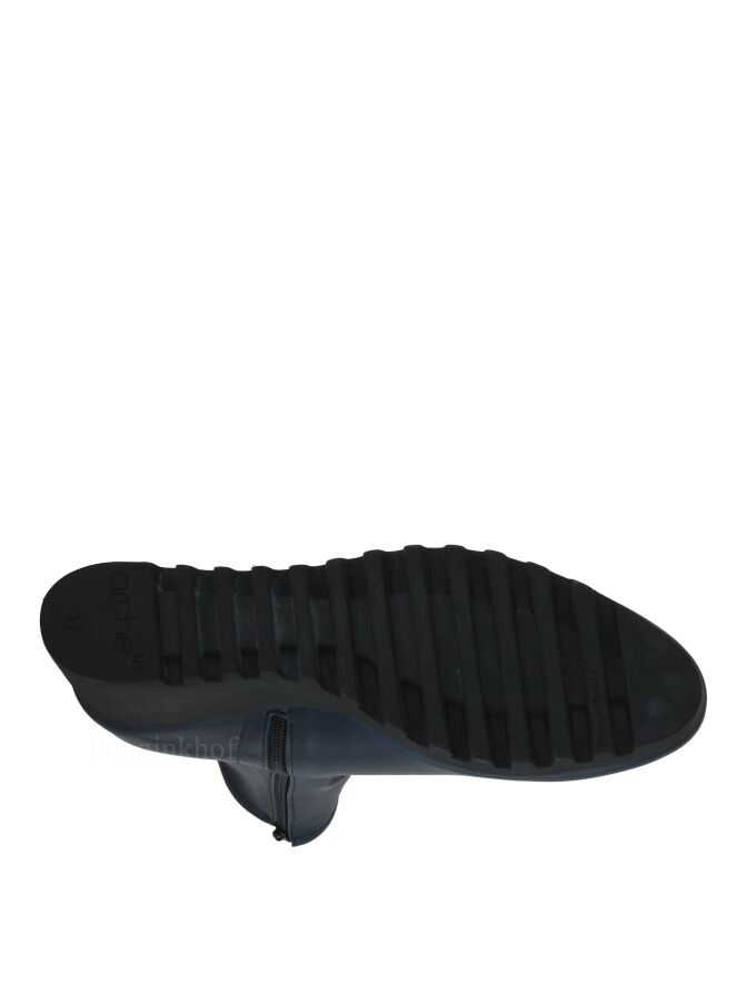 Bottine de la marque Arche, en cuir de couleur bleu nuit. Elle s'enfile grâce à sa fermeture Eclair sur le côté intérieur. La semelle compensée avec un talon de 5 cm est crantée, lui donnant un look sportif. Intérieur non doublé.