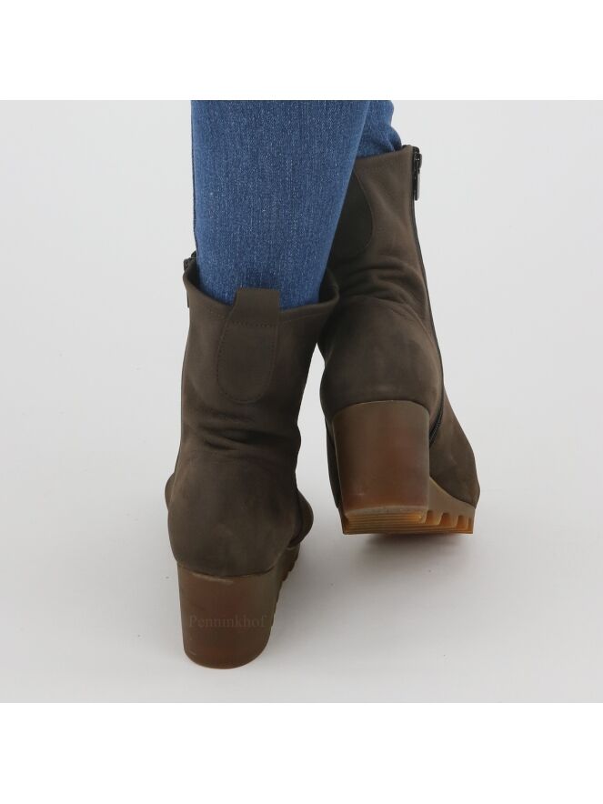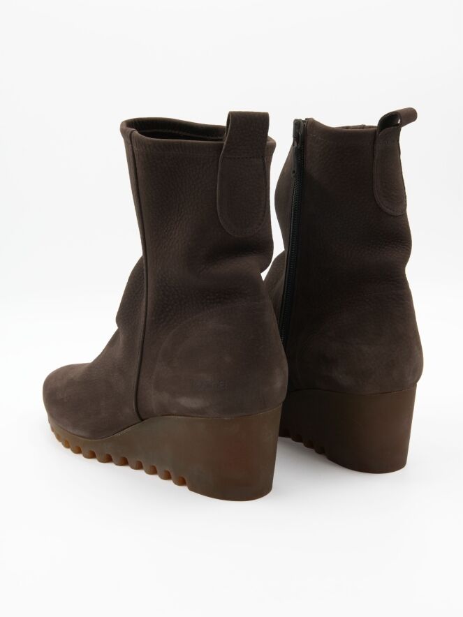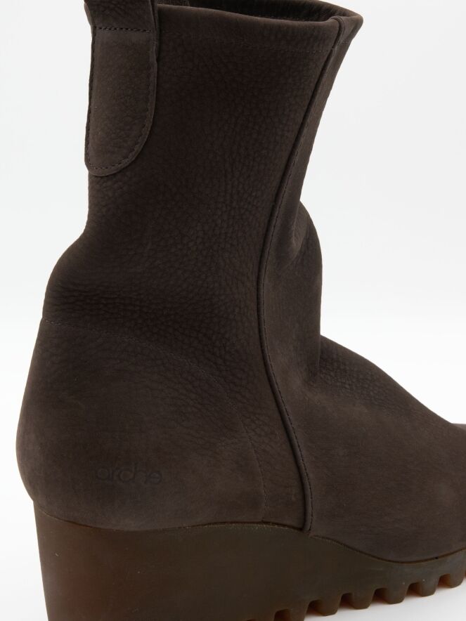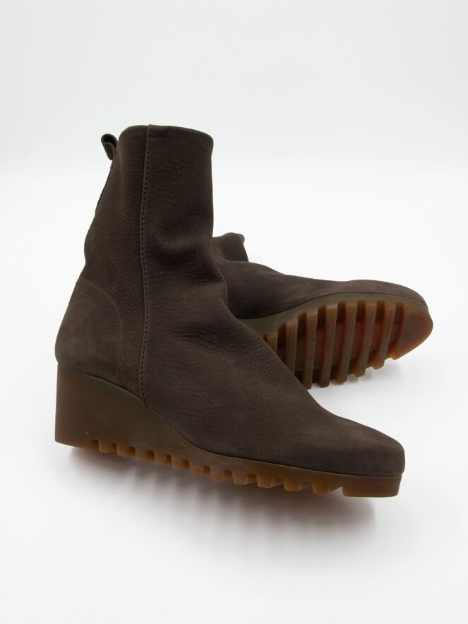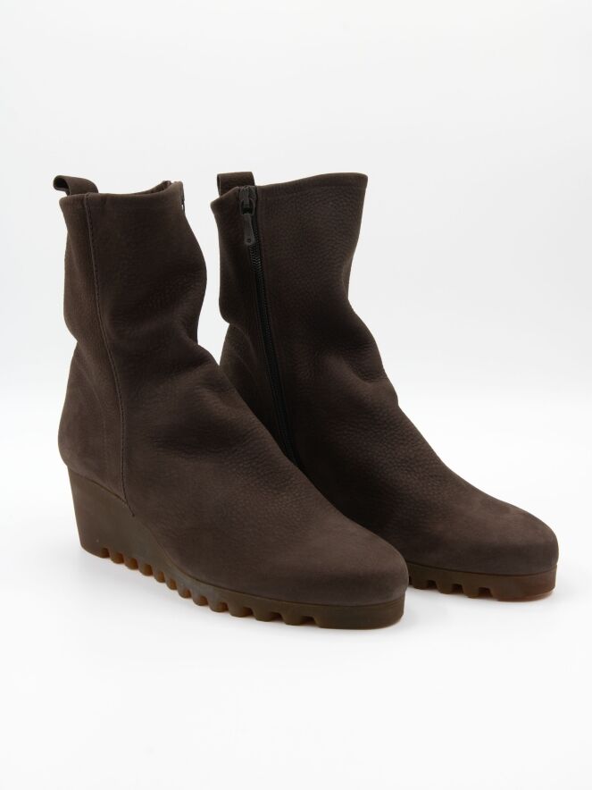 Bottine de la marque Arche, en nubuck marron moka. Elle s'enfile grâce à sa fermeture Eclair sur le côté intérieur. La semelle est compensée avec un talon de 5 cm, crantée lui donnant un look sportif. Intérieur non doublé.