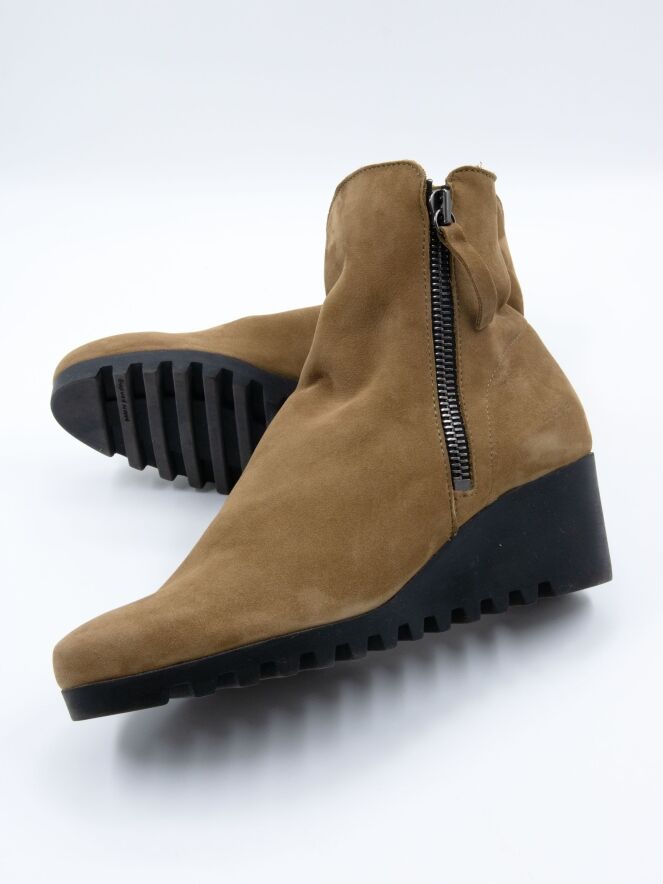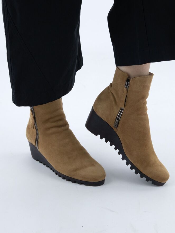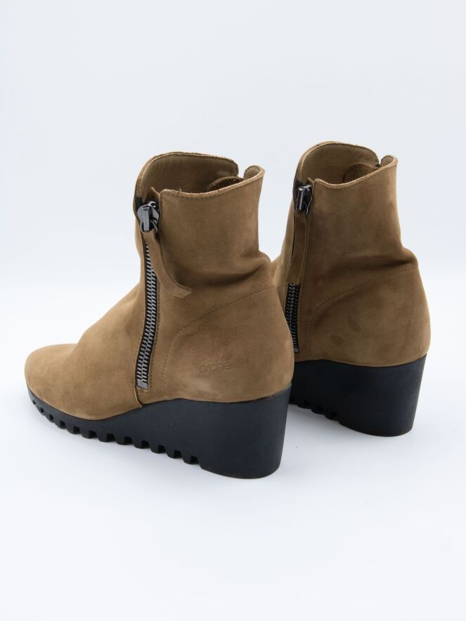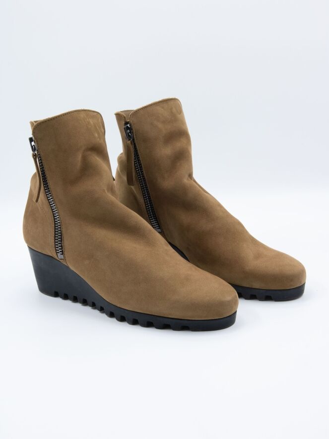 Une bottine de Arche en couleur camel. Une fermeture éclair se trouve de chaque côté de la tige. La semelle en latex présente un motif à petits blocs. L’intérieur de la bottine est non doublé.