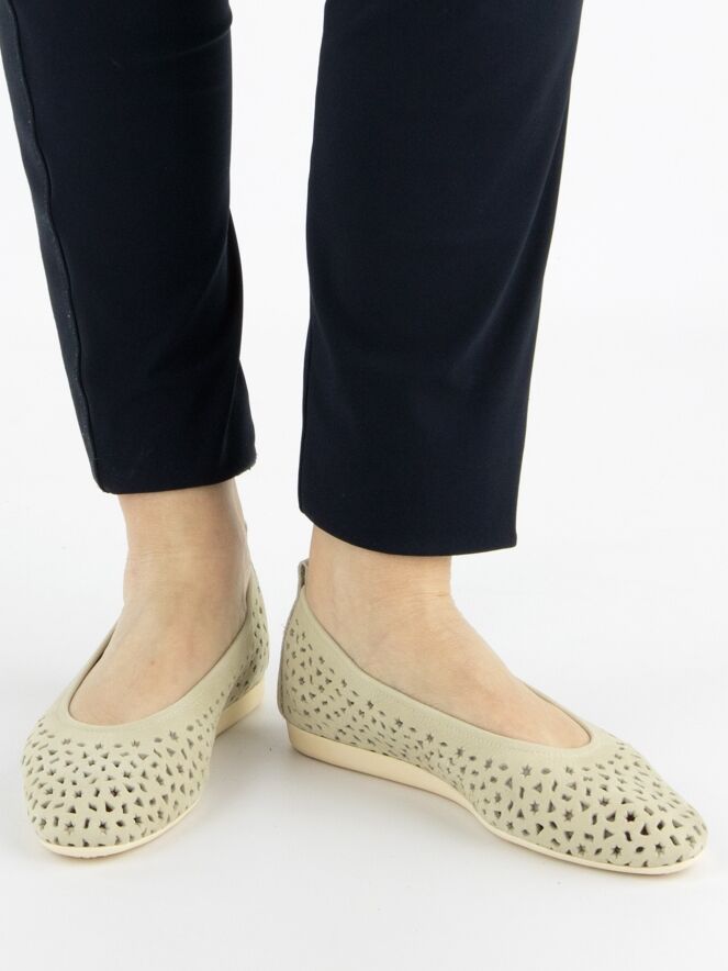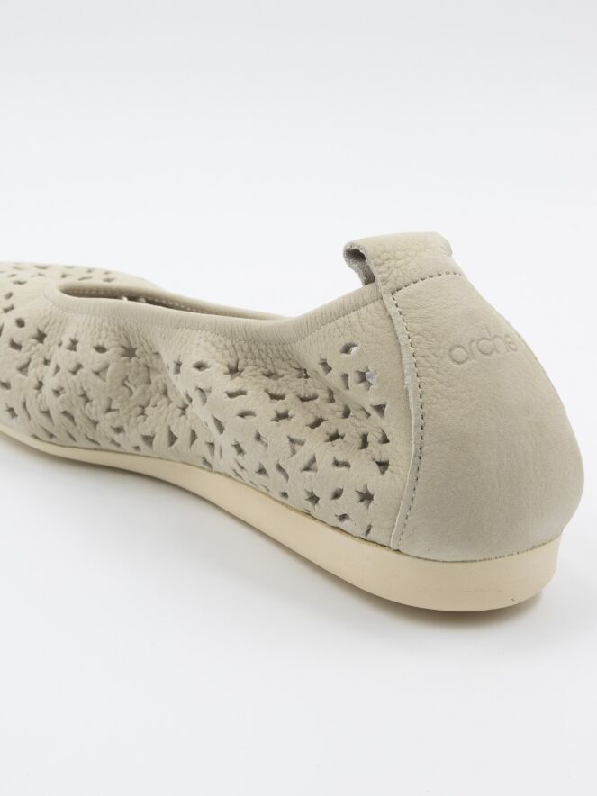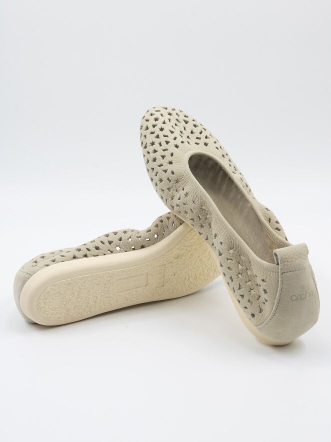 Une ballerine Arche en blanc crème. Le cuir est perforé de multiples figures, dont des étoiles et des triangles. La ballerine a un bout rond et n'est pas doublée.