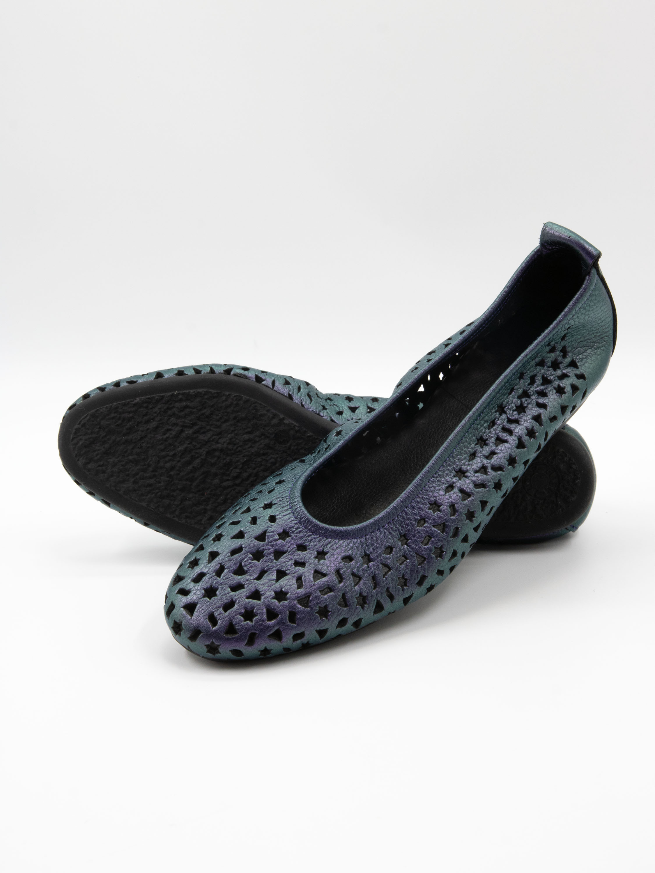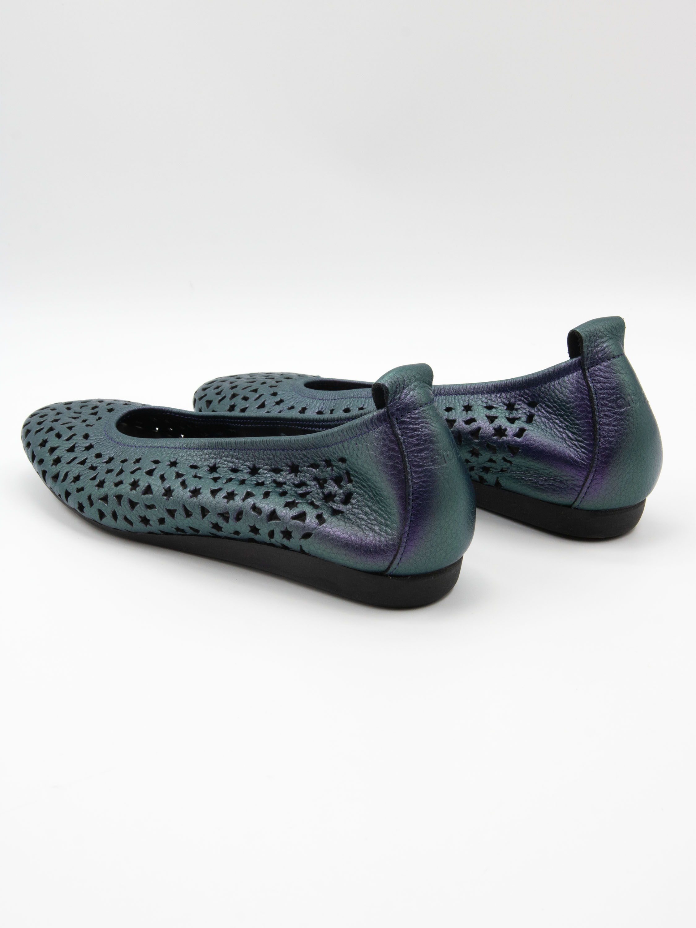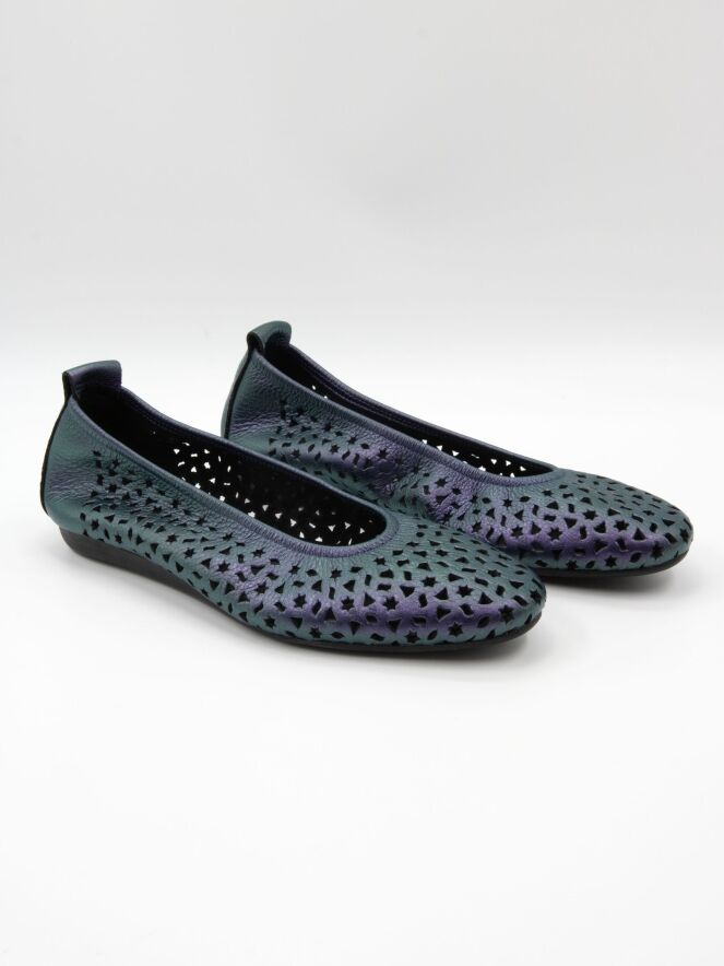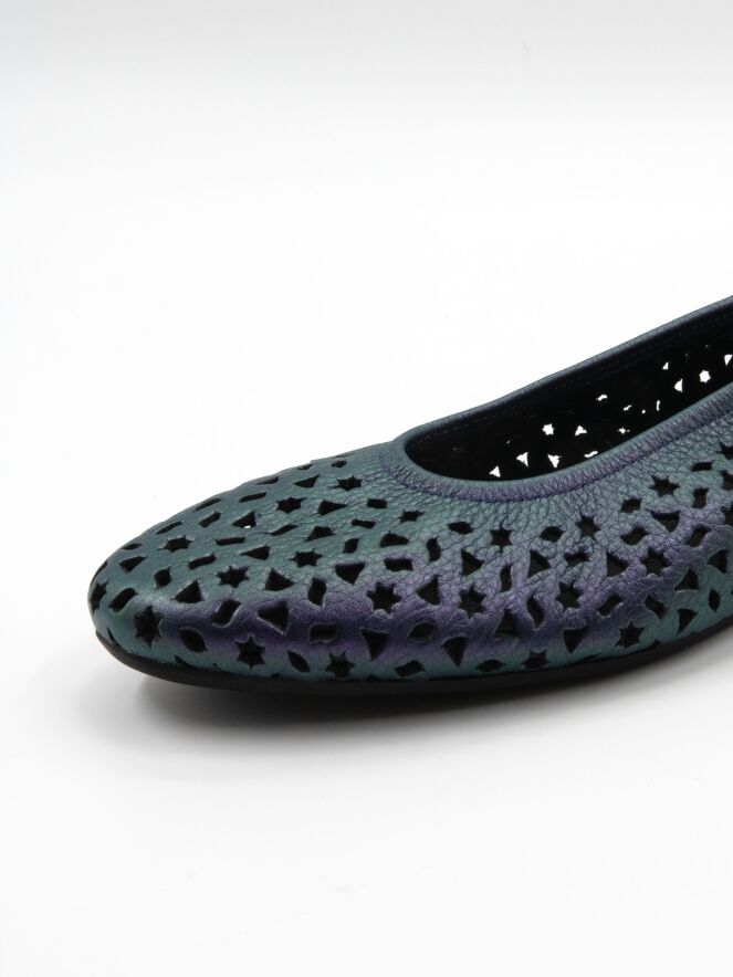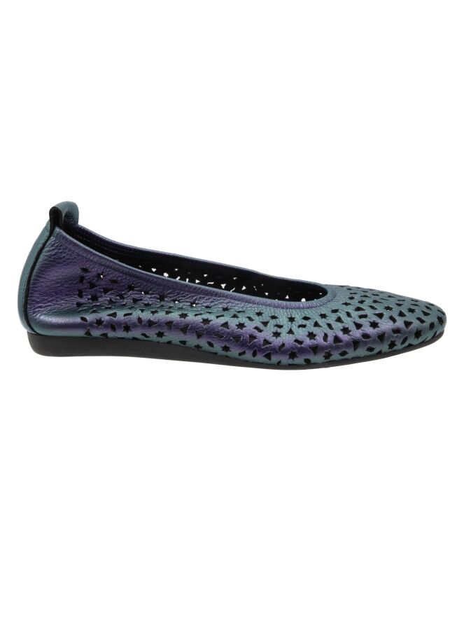 Ballerine de Arche dans une élégante teinte violet métallisé. Le cuir est délicatement perforé de motifs ludiques, tels que des étoiles et des triangles, apportant une touche aérienne et contemporaine. Dotée d’un bout arrondi et d’un intérieur non doublé pour plus de souplesse, elle repose sur une semelle en latex flexible offrant un excellent amorti, tandis que l’arrière légèrement surélevé assure un confort supplémentaire.