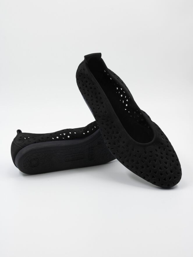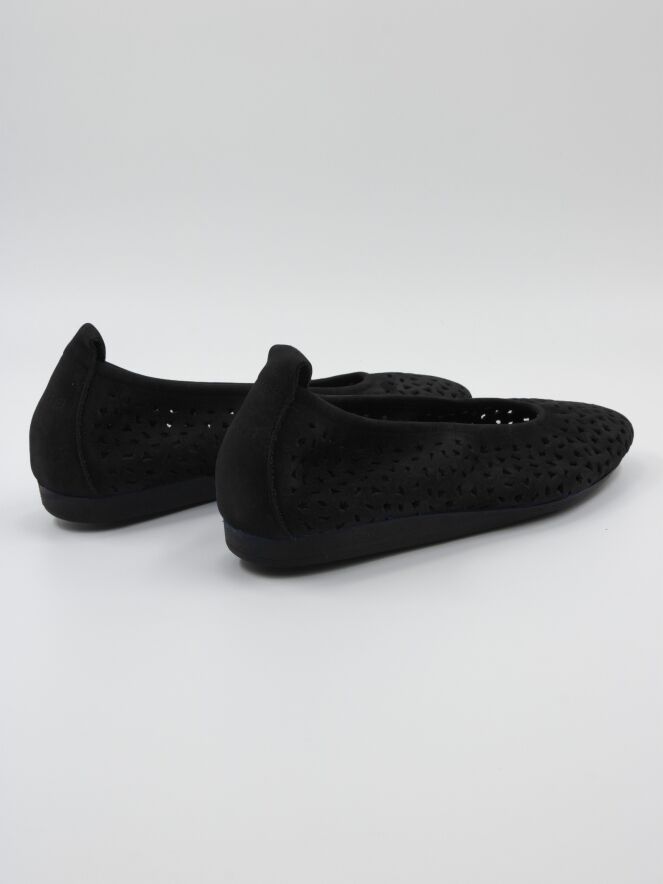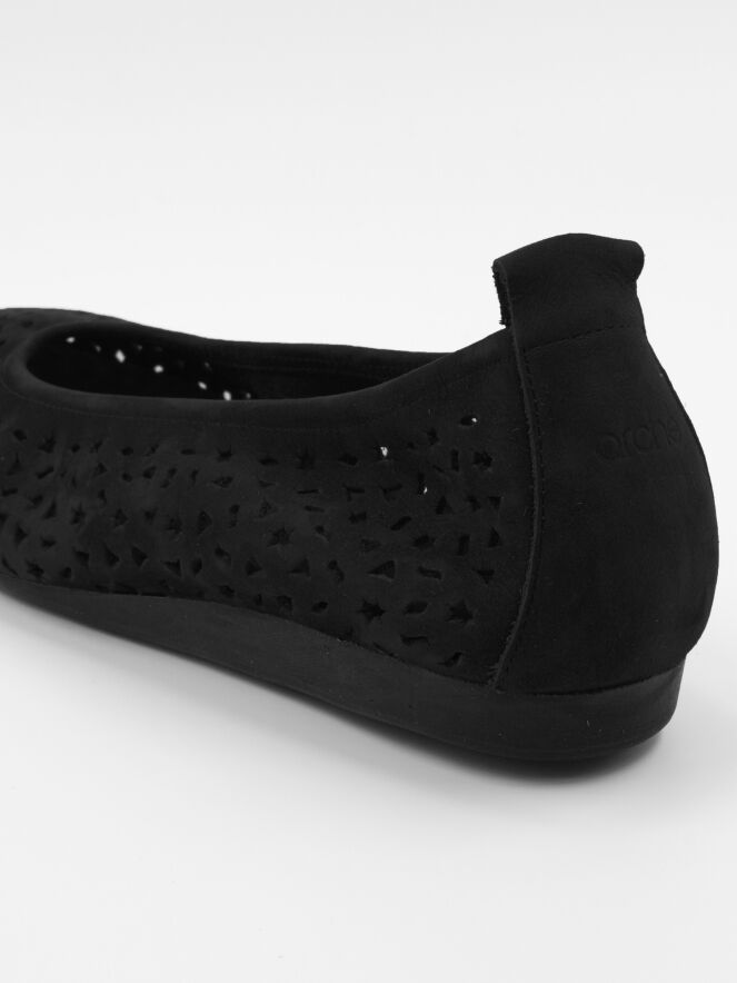Une ballerine d'Arche en couleur noire. Le daim nubuck est perforé avec plusieurs formes, y compris des étoiles et des triangles. La ballerine a un bout rond et n'est pas doublée.