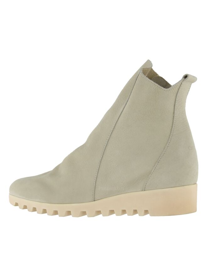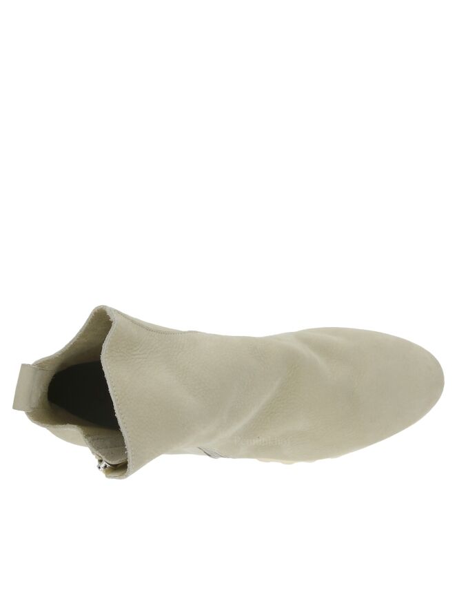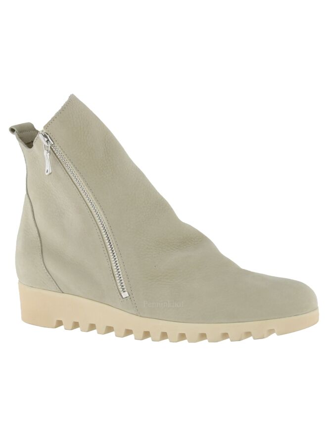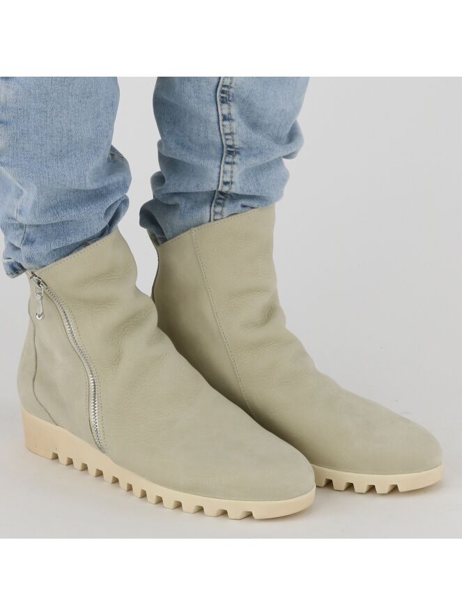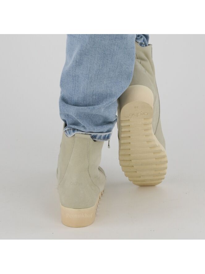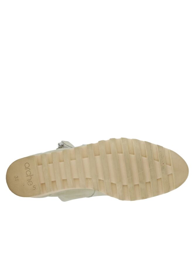 Bottine courte de la marque Arche, de couleur blanc crème. L'extérieur de la tige est équipé d'une fermeture Eclair argentée. La botte présente un nez rond fin et une semelle crantée. Intérieur non doublé.