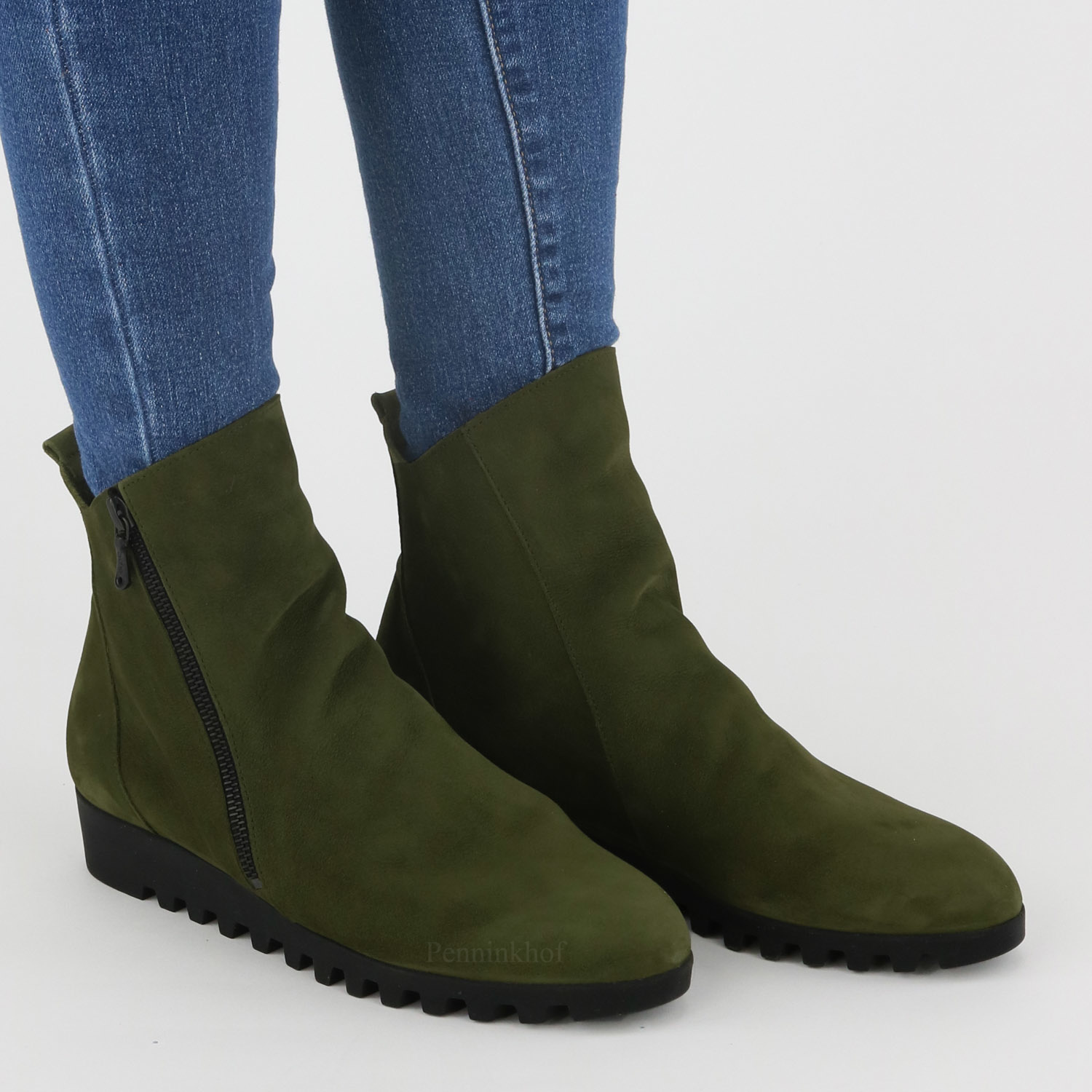 Bottine courte de la marque Arche, de couleur verte. L'extérieur de la tige est équipé d'une fermeture Eclair. La botte présente un nez rond fin et une semelle crantée. Intérieur non doublé.