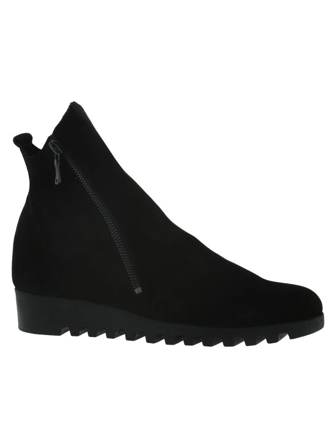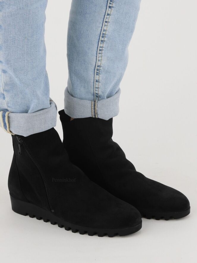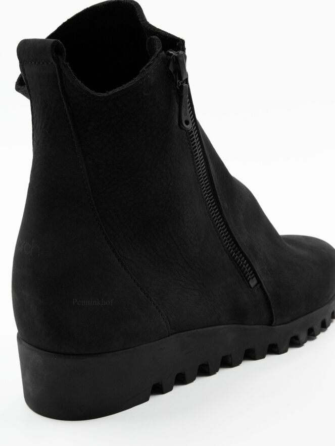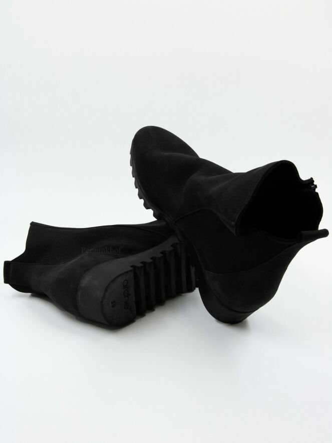 Bottine courte de la marque Arche, de couleur noire. L'extérieur de la tige est équipé d'une fermeture Eclair. La botte présente un nez rond fin et une semelle crantée. Intérieur non doublé.