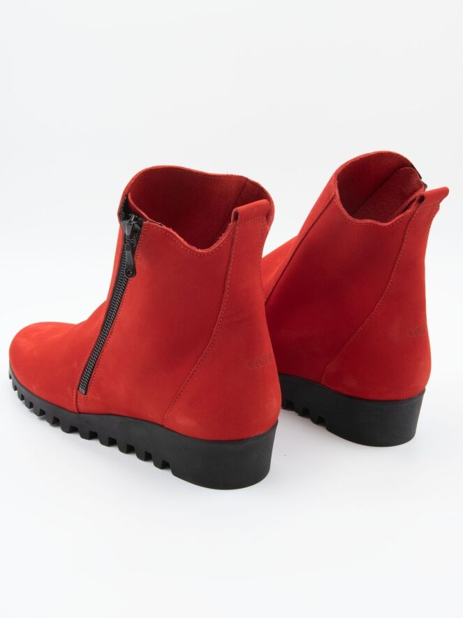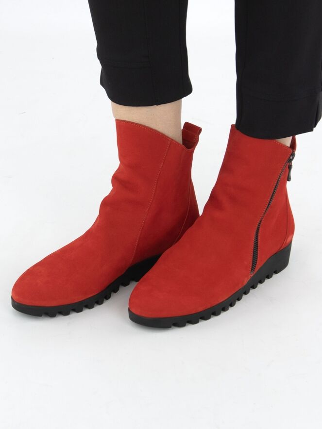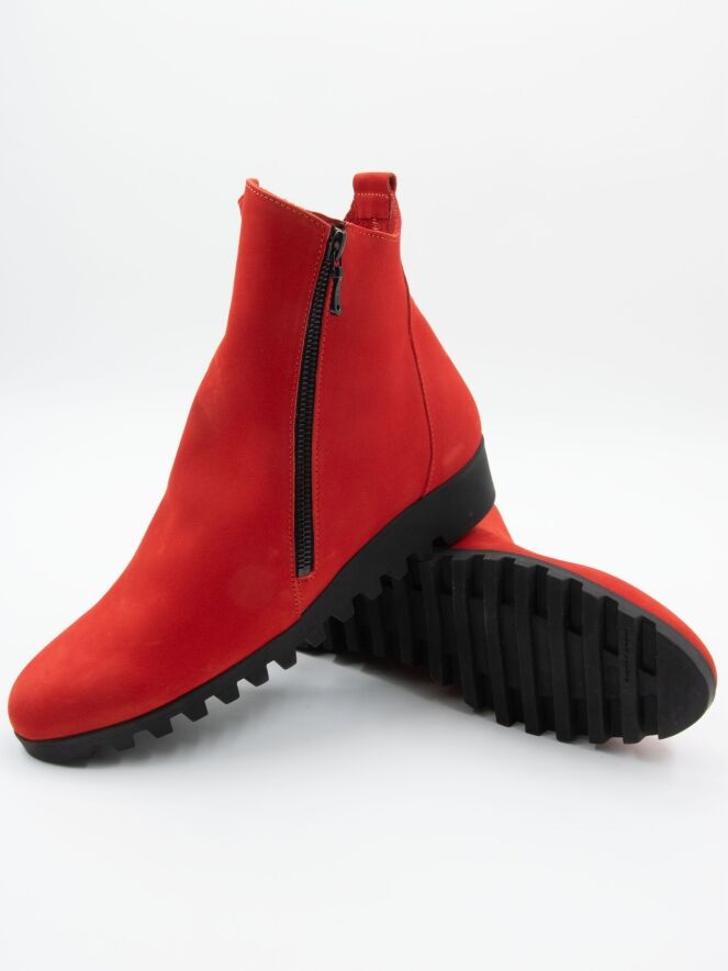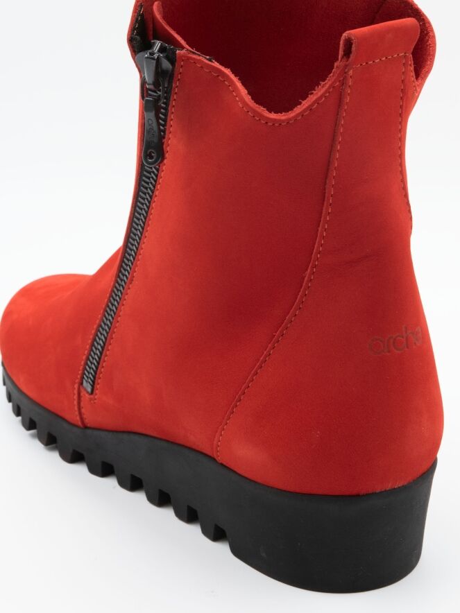 Une bottine courte de la marque Arche, de couleur rouge vif. A l'extérieur se trouve une fermeture éclair noire. La semelle est dentelée. La bottine a un nez rond et l'intérieur n'est pas doublé.