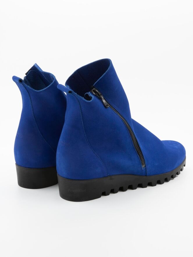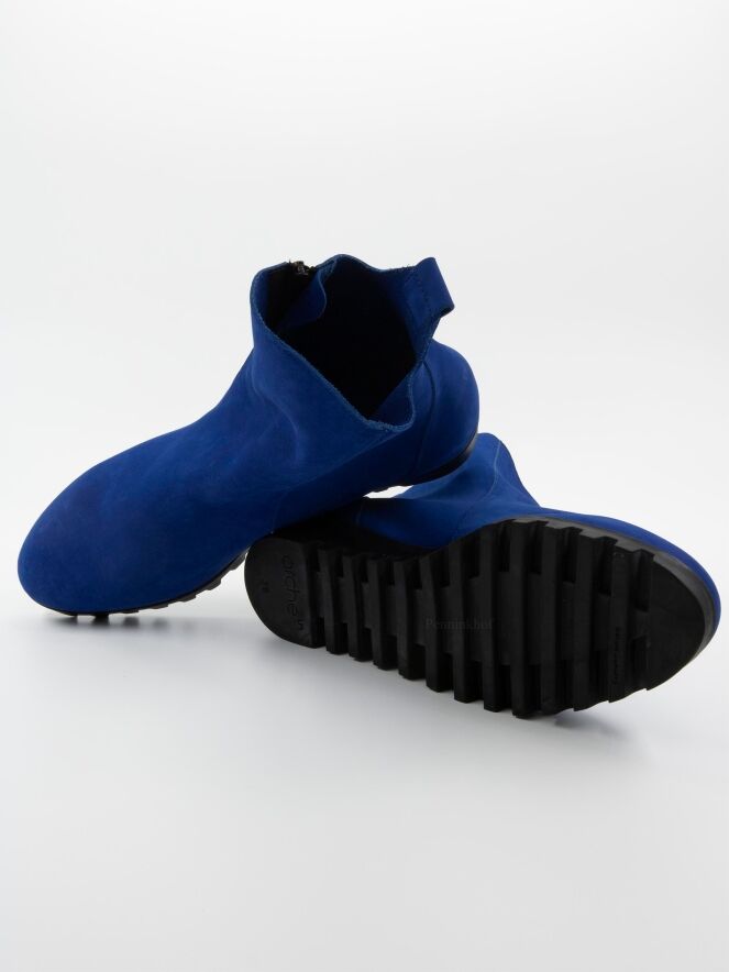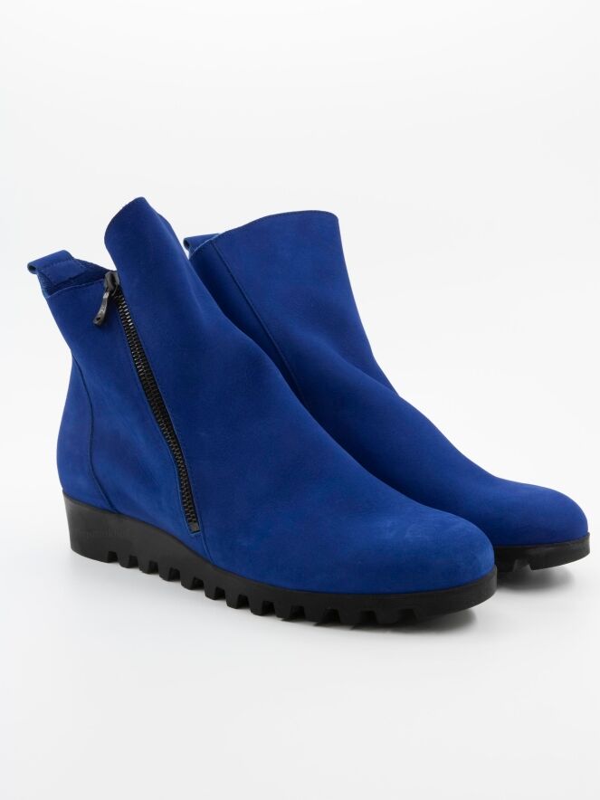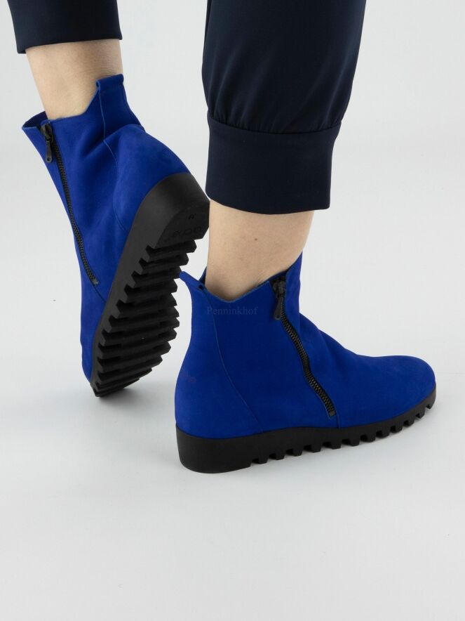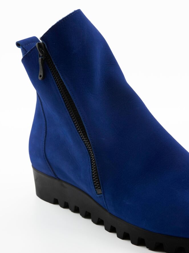 Une bottine courte de Arche dans la couleur bleu cobalt. Une fermeture éclair se trouve à l'extérieur. La semelle est crénelée. Le nez de la botte est rond et l'intérieur n'est pas doublé.
