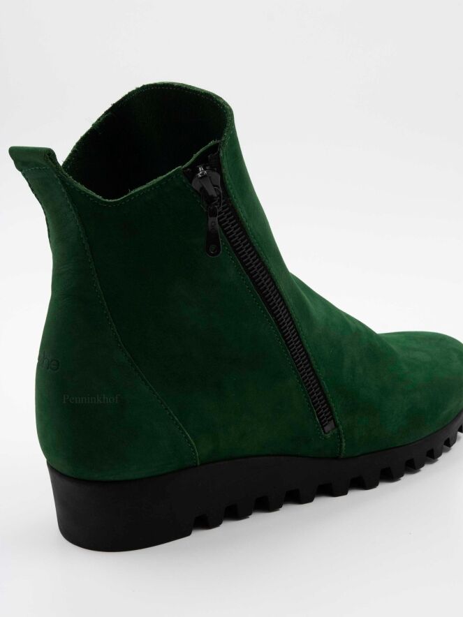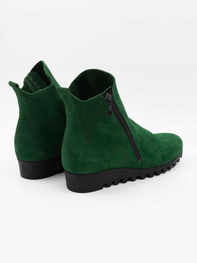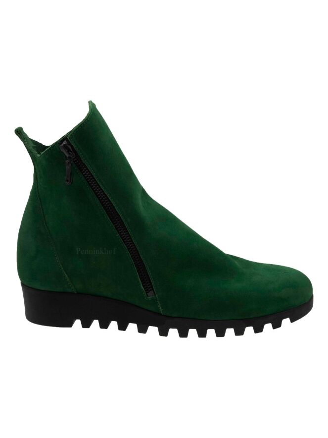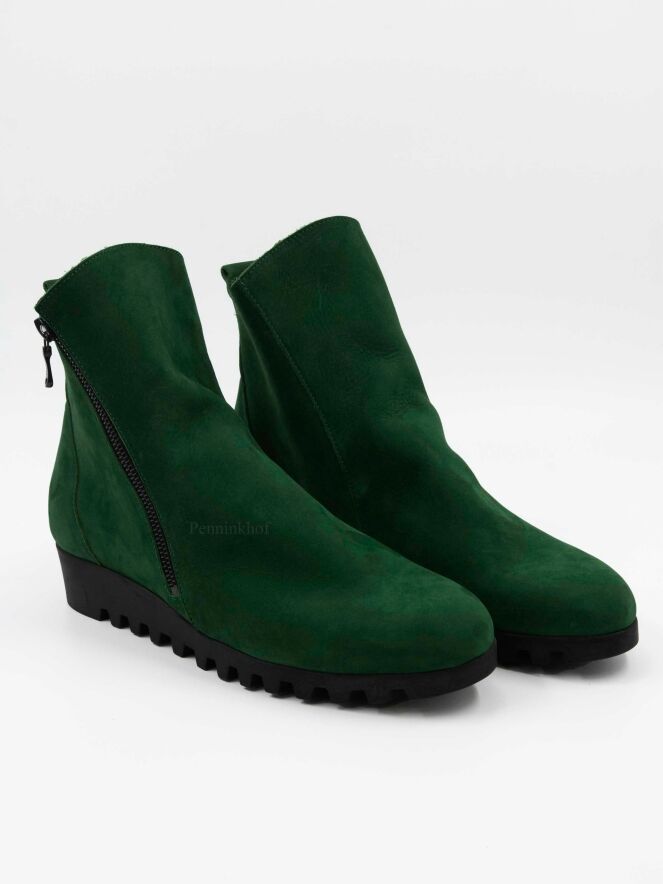 Une bottine courte de Arche dans la couleur verte. Sur l'extérieur se trouve une fermeture à glissière. La semelle est crénelée. Le nez de la botte est rond et l'intérieur n'est pas doublé.