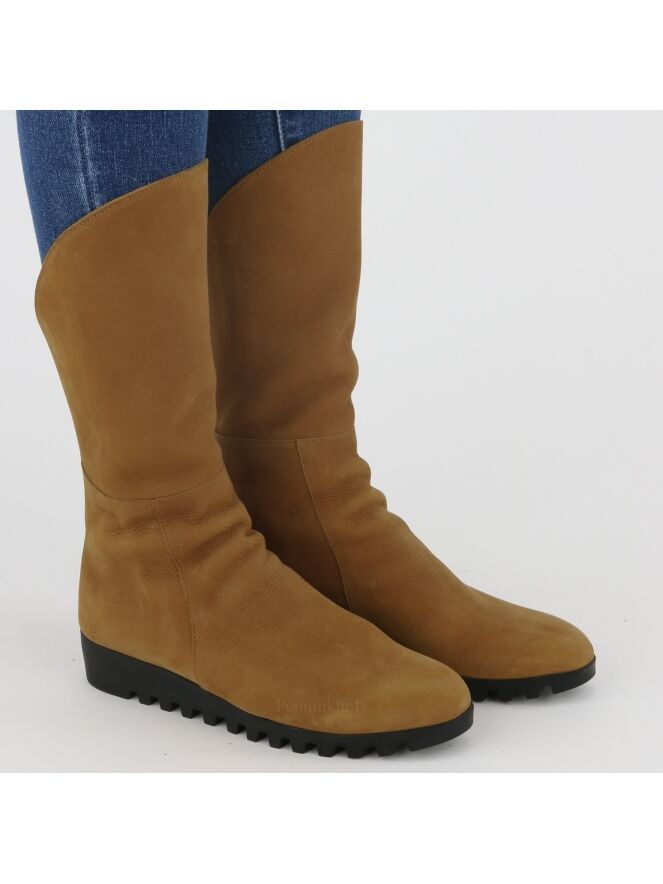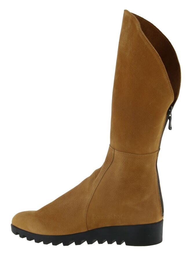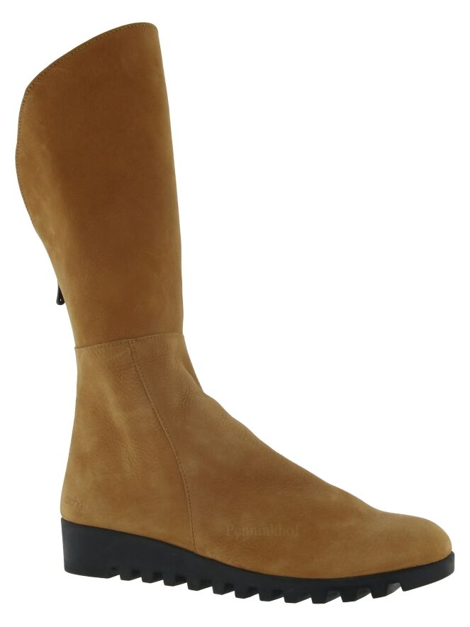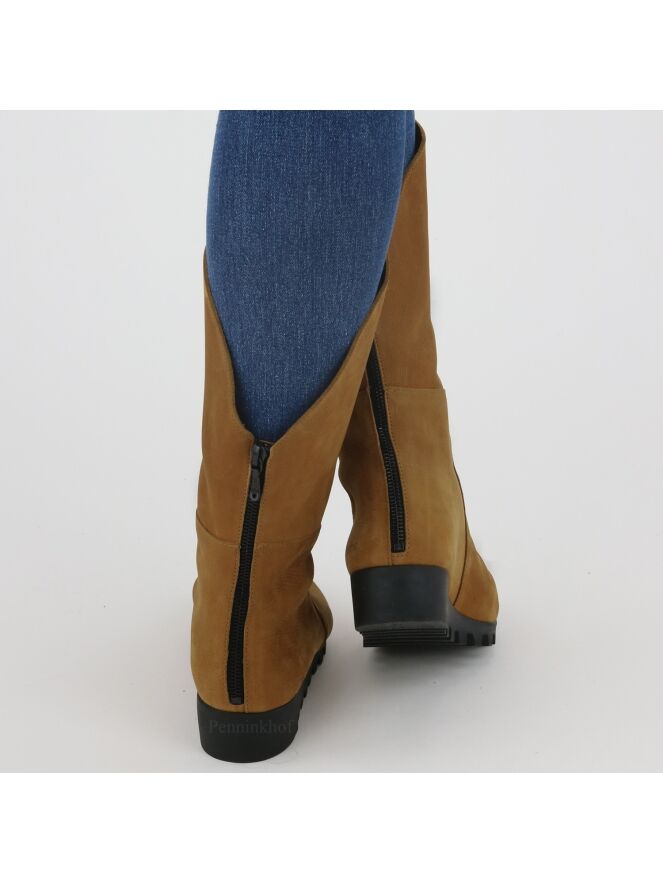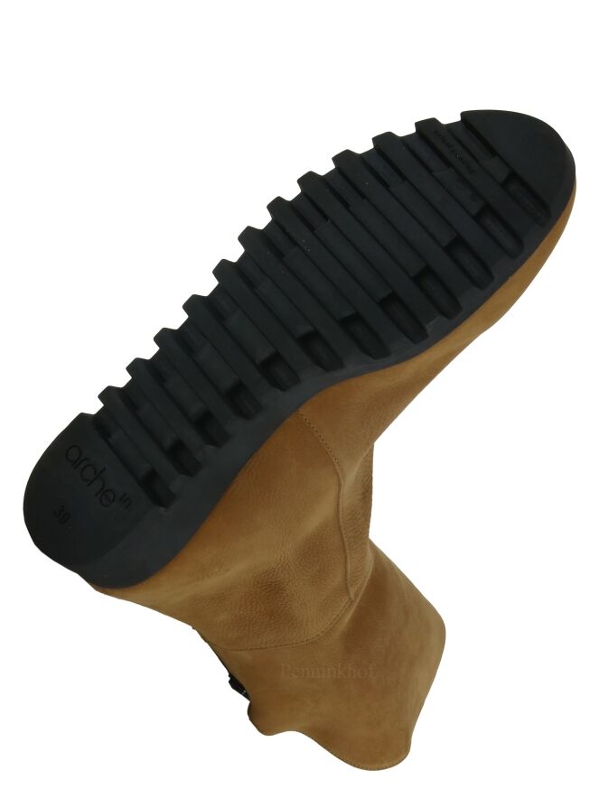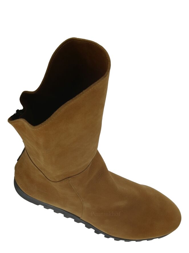 Botte mi-haute de la marque Arche, en nubuck de couleur cognac. La botte est dotée d'une semelle noire crantée. La tige présente une belle découpe asymétrique. L’arrière de la botte est équipé d'un zip de fermeture sur toute sa hauteur. Intérieur non doublé.