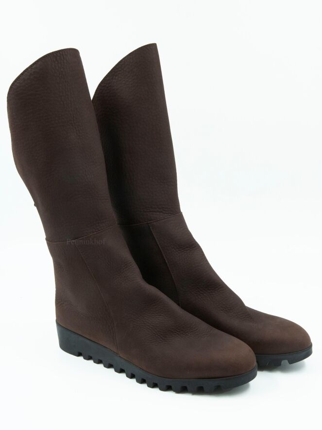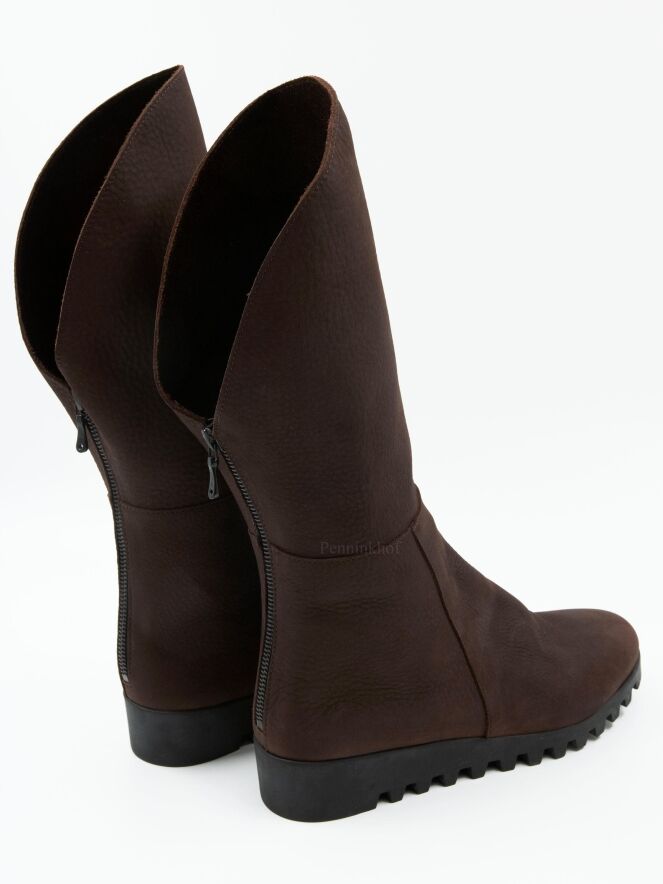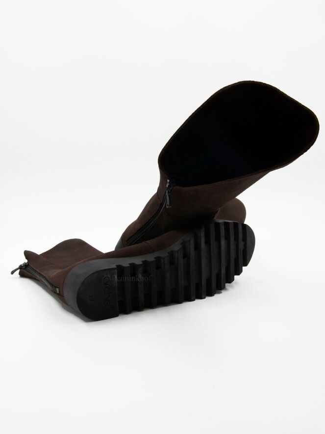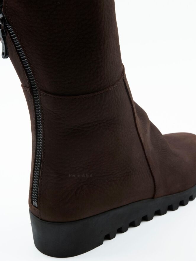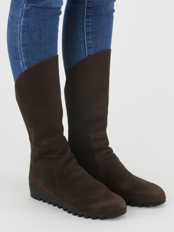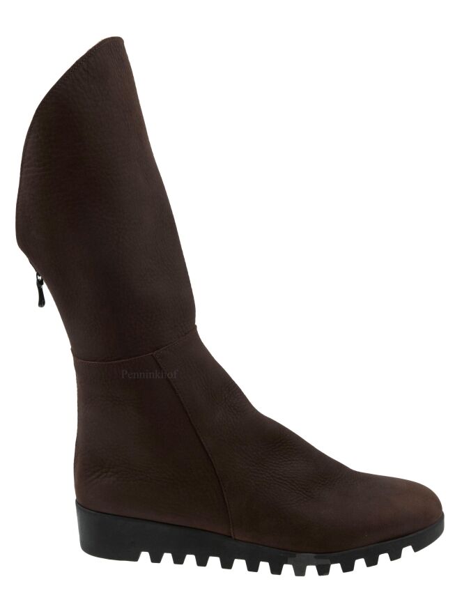 Botte mi-haute de la marque Arche, en nubuck de couleur moka. La botte est dotée d'une semelle noire crantée. La tige présente une belle découpe asymétrique. L’arrière de la botte est équipé d'un zip de fermeture sur toute sa hauteur. Intérieur non doublé.