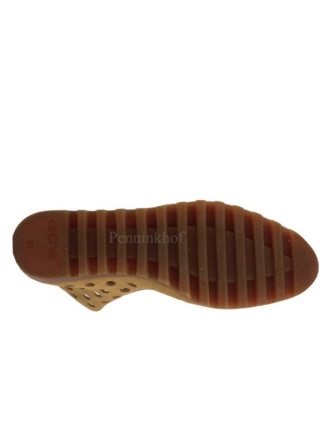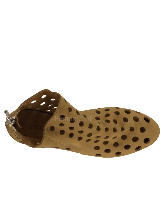 Cette bottine d'été en nubuck de couleur cognac finement perforé, de la marque Arche, monte jusqu'à la cheville. Ce modèle s’enfile très facilement grâce à la souplesse de son cuir ainsi qu’à sa fermeture Eclair à l'arrière. Elle possède aussi une grande flexibilité et confort grâce à sa semelle crantée en latex. L'intérieur n’est pas doublé.