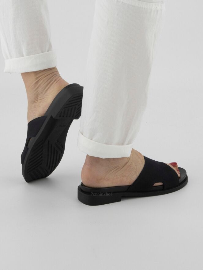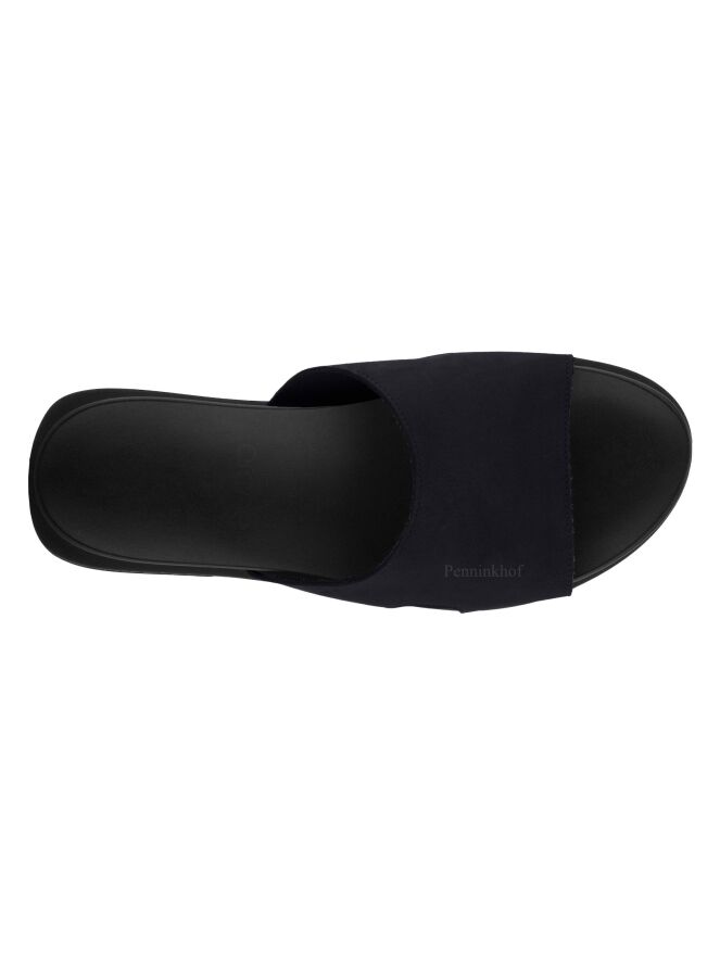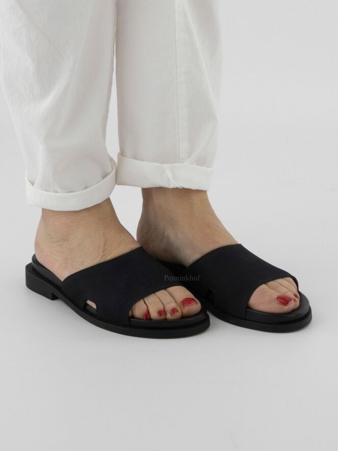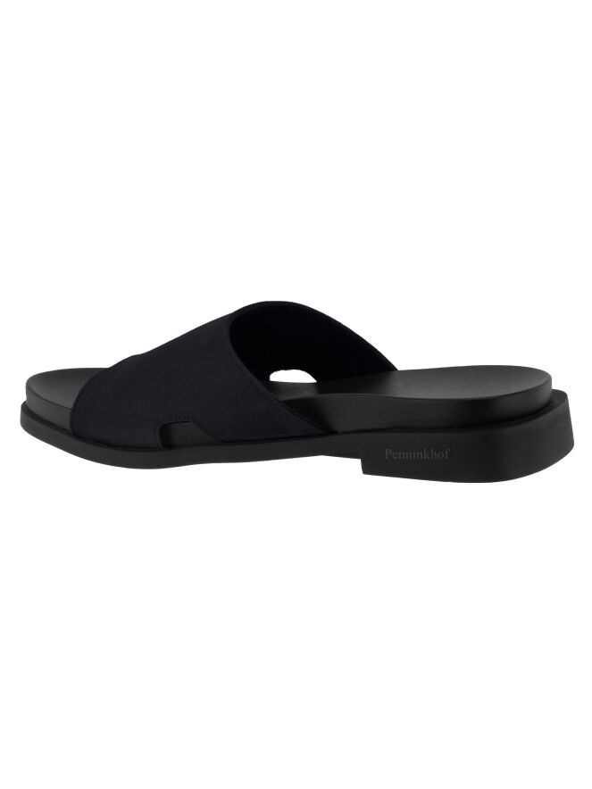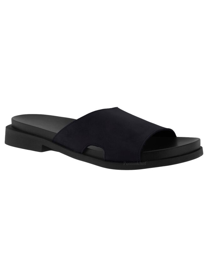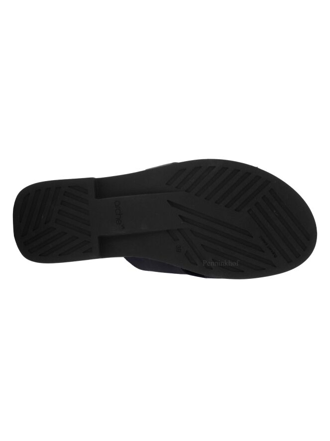 Sandale ouverte de la marque Arche, en nubuck de couleur bleu marine. Une semelle noire souple est placée sur la semelle en latex. Sur les côtés de la sandale se trouve une petite ouverture de chaque côté.