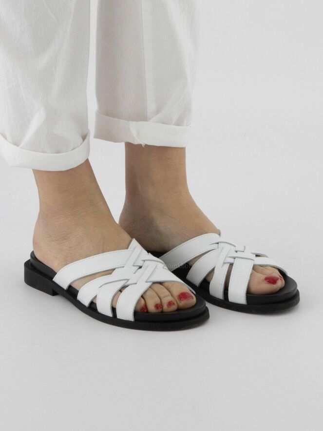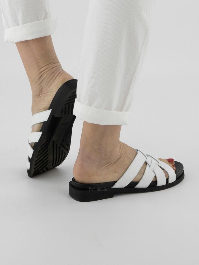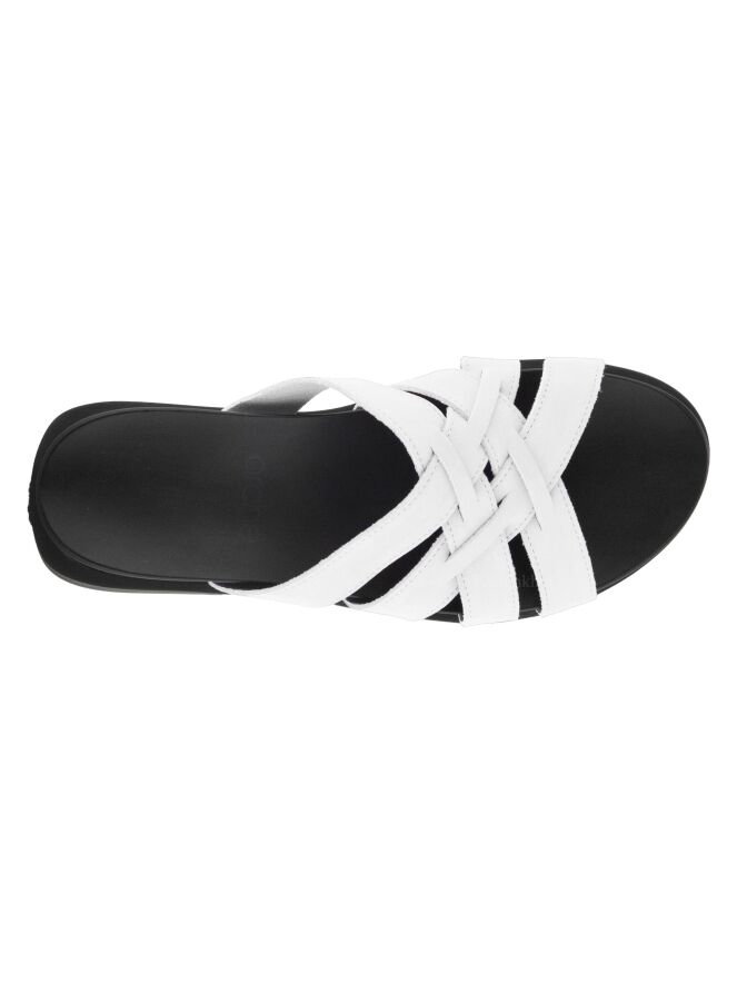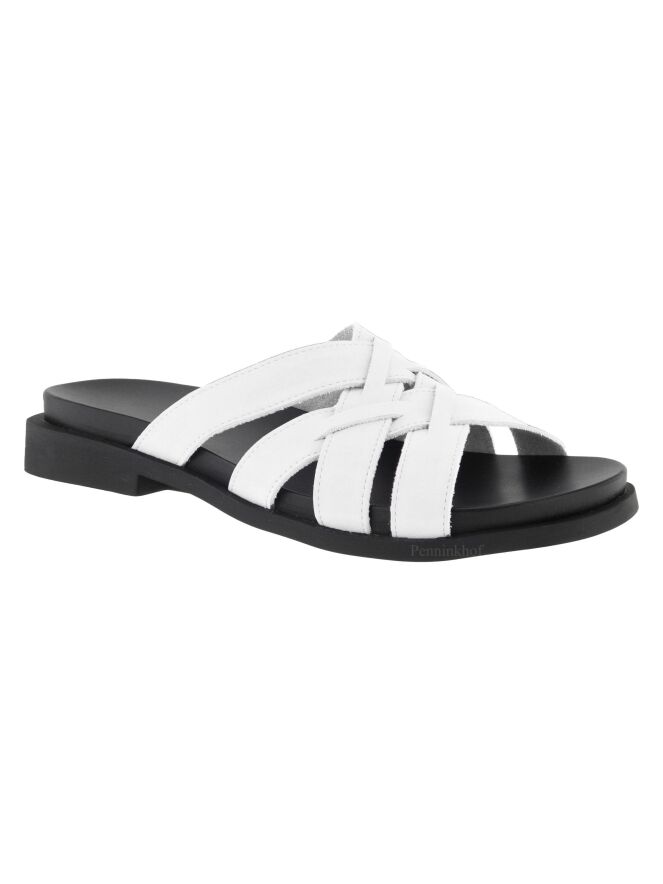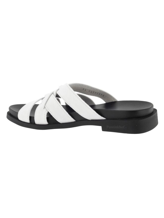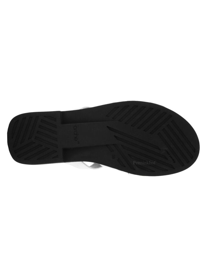 Sandale ouverte de la marque Arche, en cuir de couleur blanche. Une semelle noire souple est placée sur la semelle en latex. L'avant-pied est composé de 4 lanières de cuir souple entrecroisées.