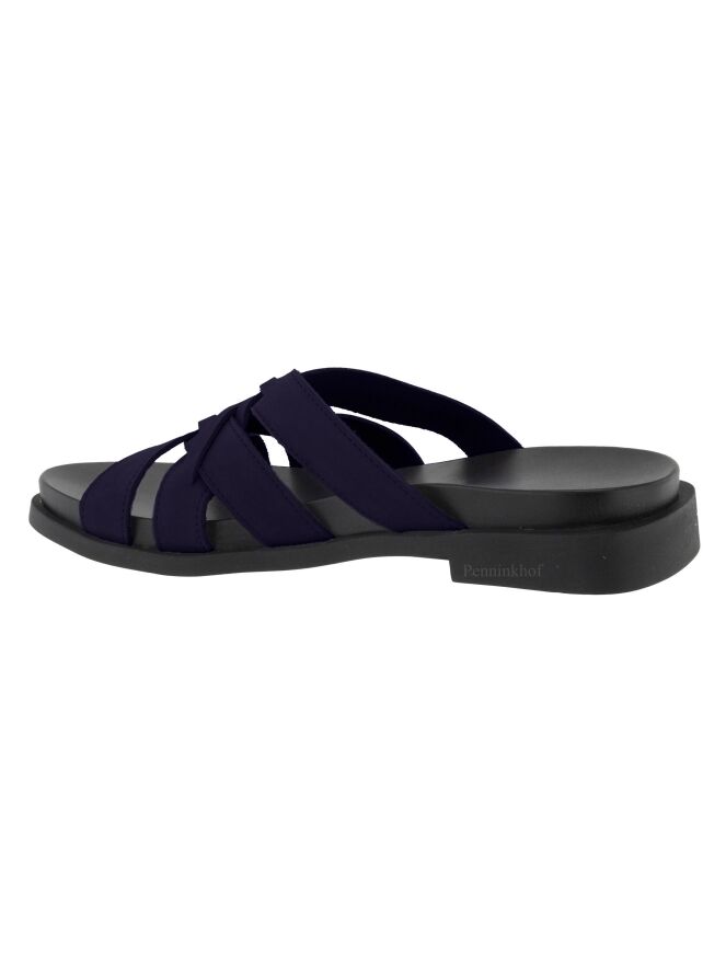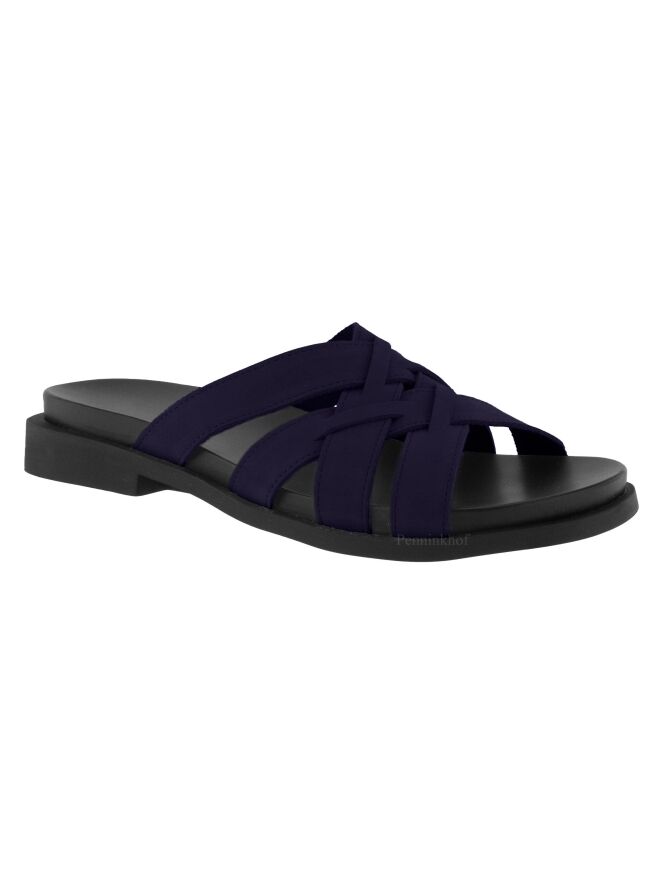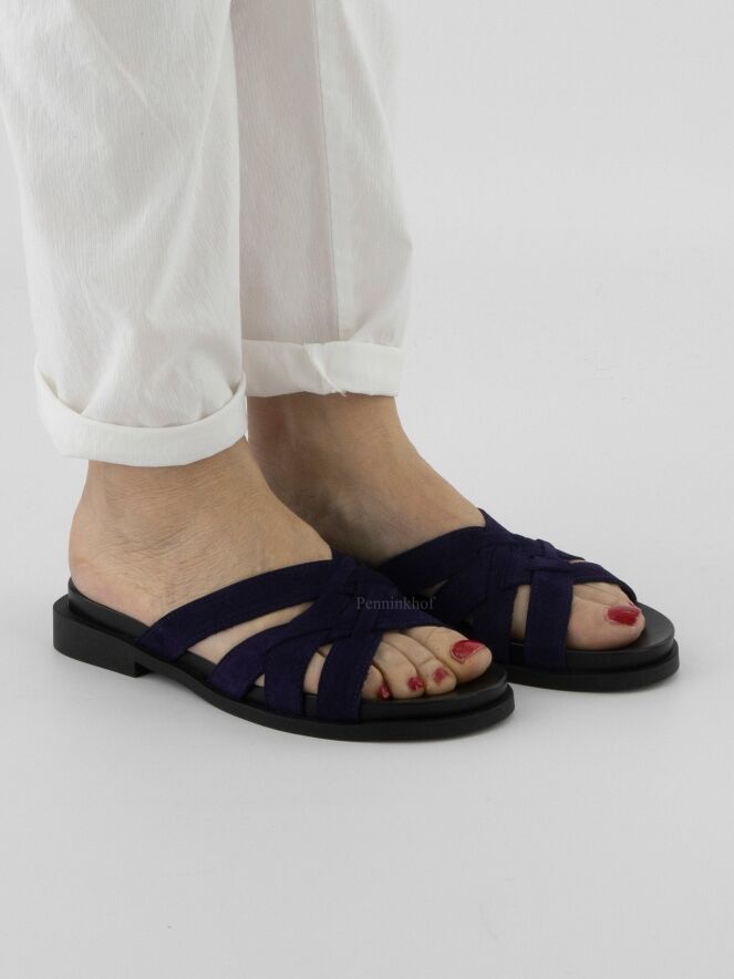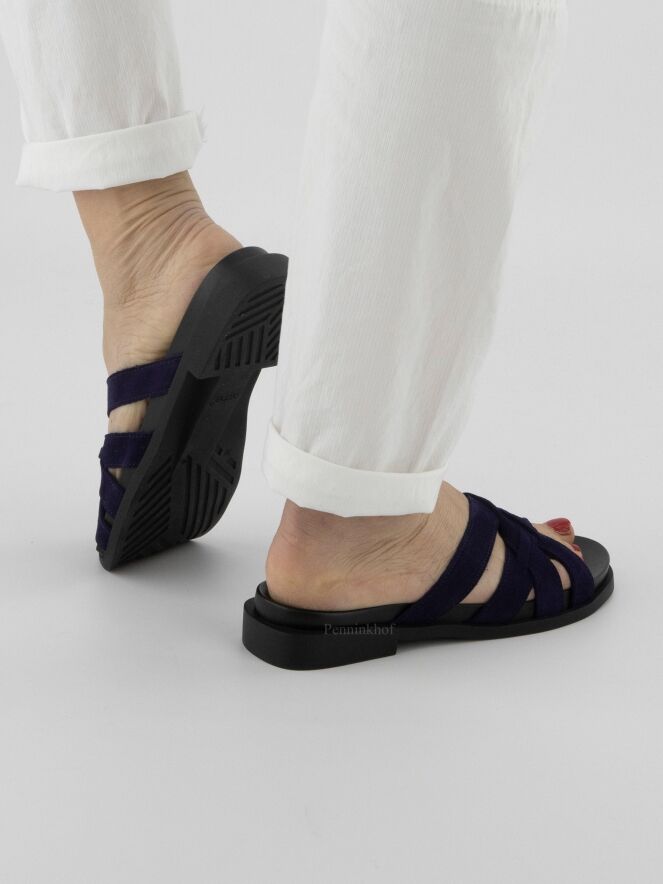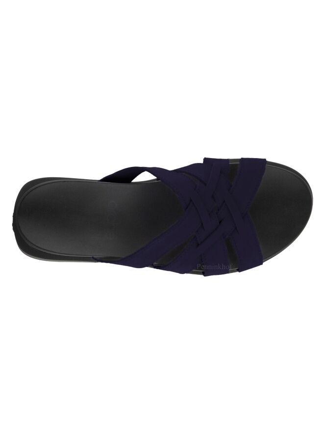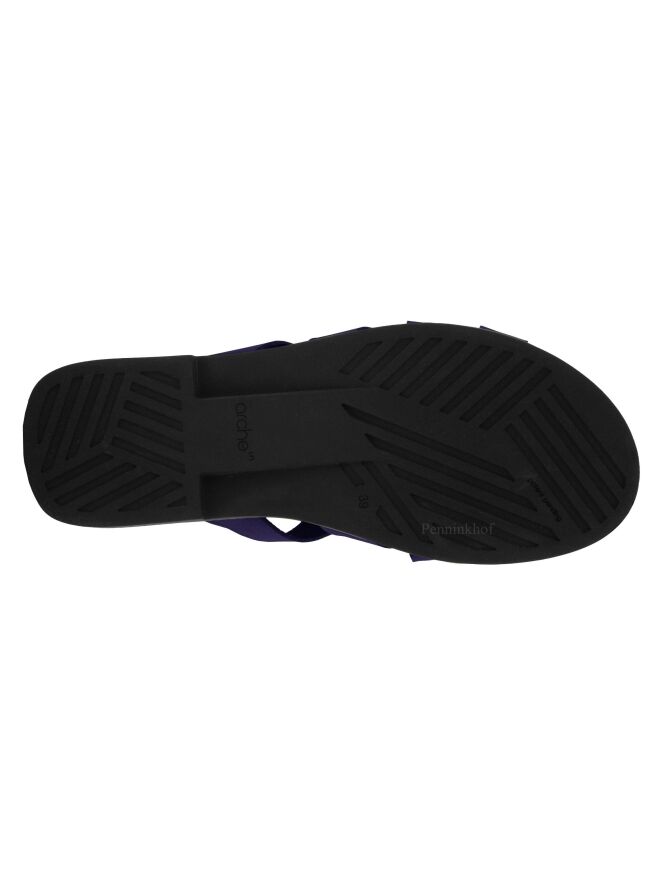 Sandale de la marque Arche, de couleur violet foncé. Une assise plantaire souple est placée sur la semelle en latex. Quatre brides en nubuck s'entrecroisent sur l'avant-pied.