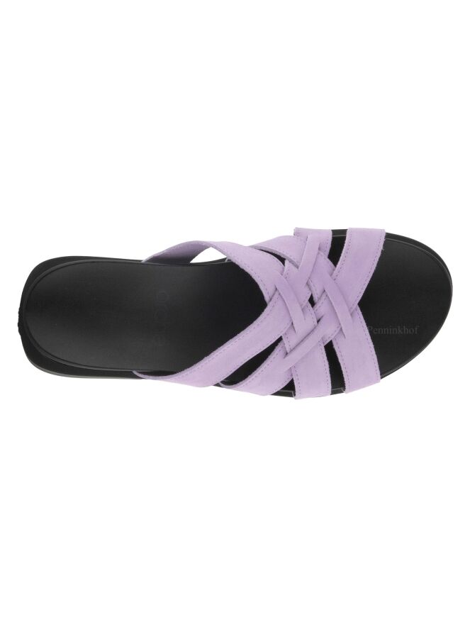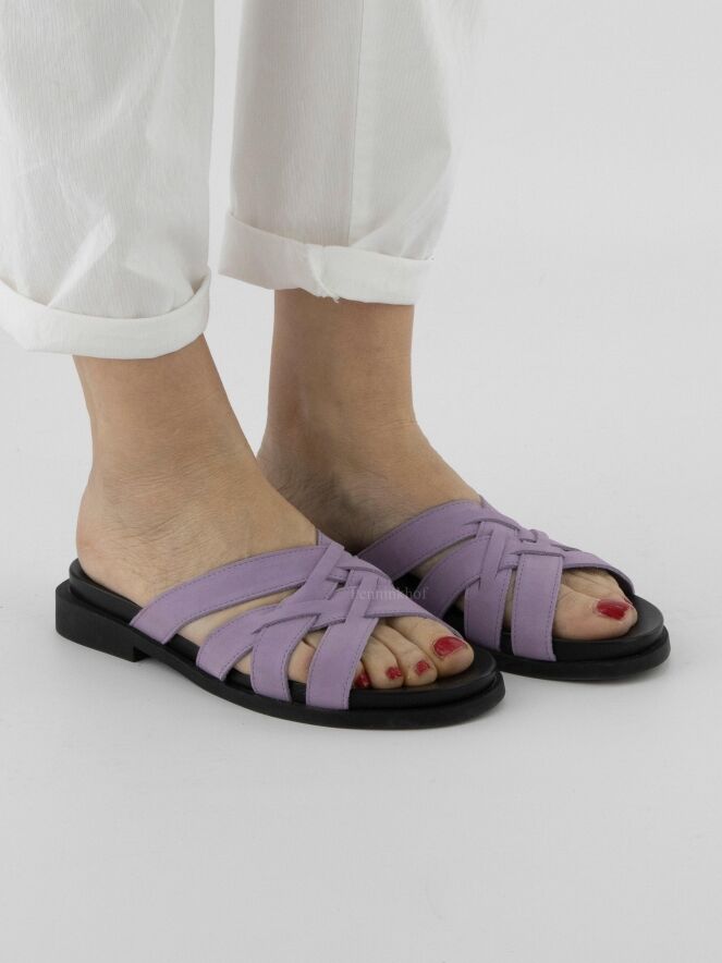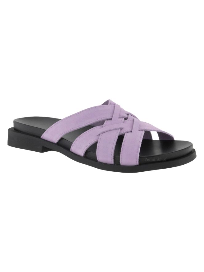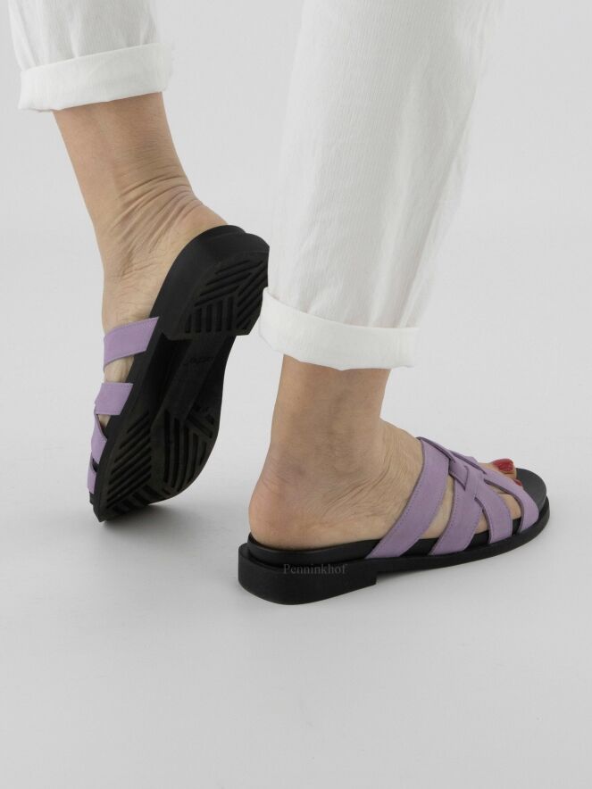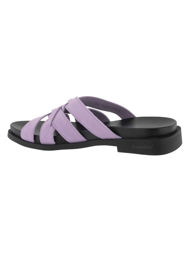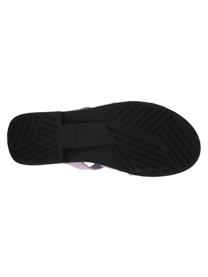 Sandale ouverte de la marque Arche, en cuir de couleur lilas. Une assise plantaire souple est placée sur la semelle en latex. L'avant-pied est composé de 4 lanières de cuir souple entrecroisées.