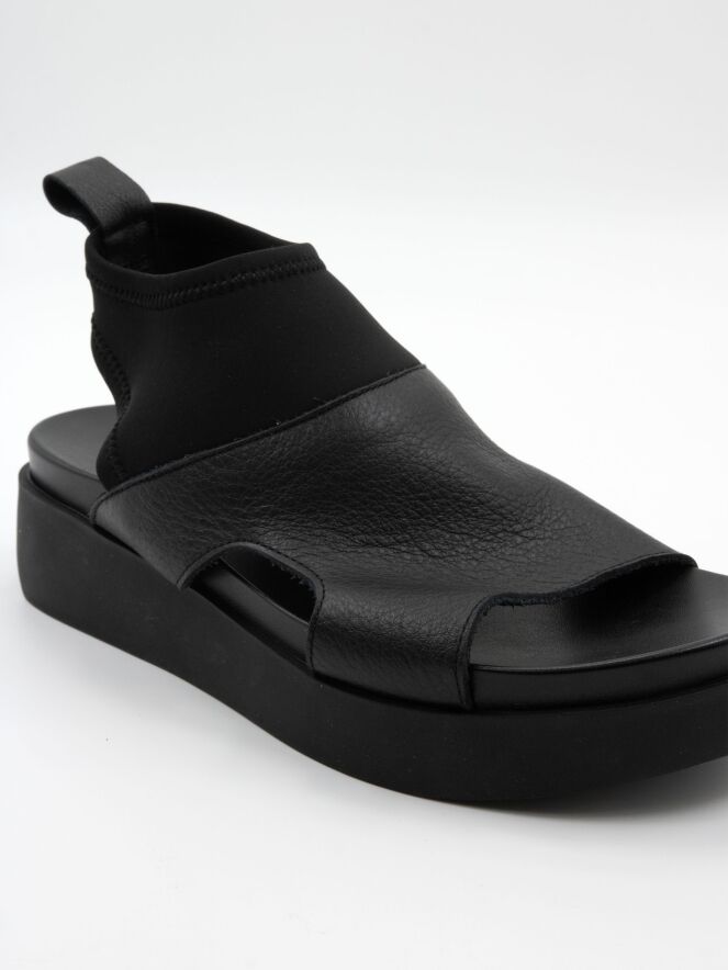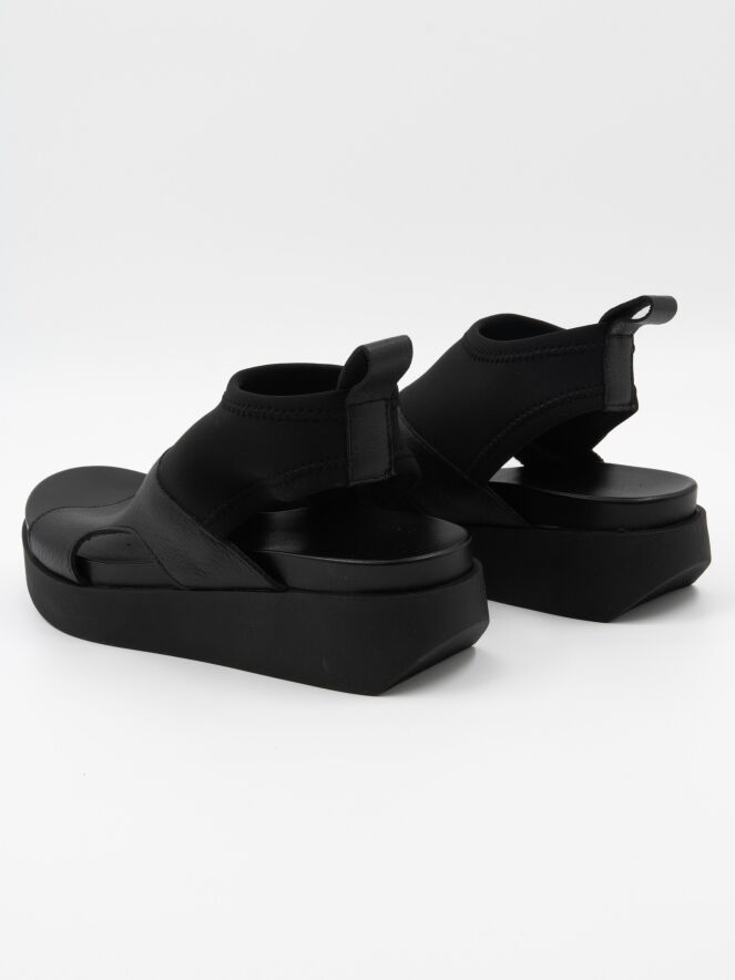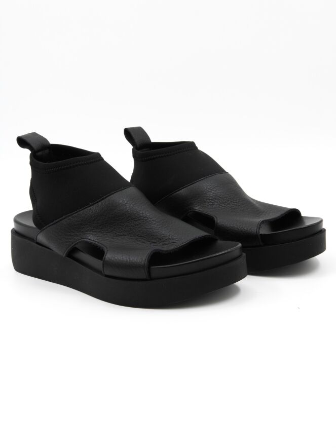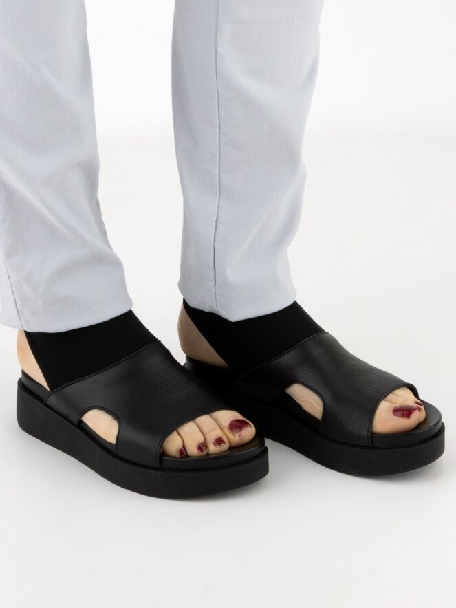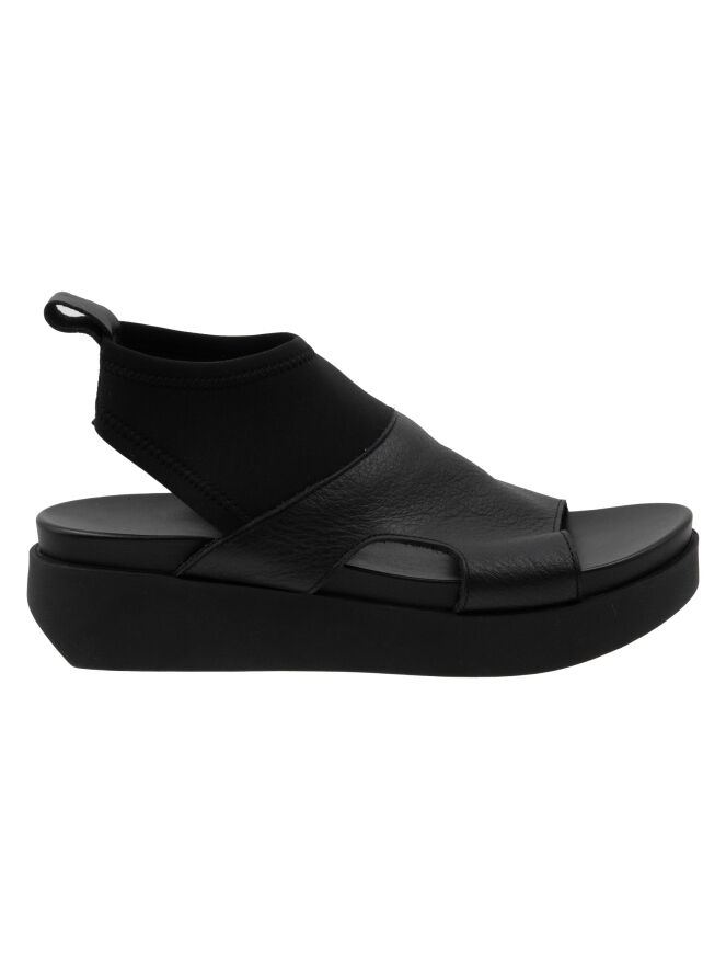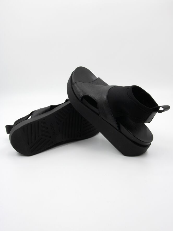 Une sandale d'Arche avec une semelle compensée de couleur noire. De la partie supérieure de l'avant-pied jusqu'à la cheville se trouve un tissu élastique noir.