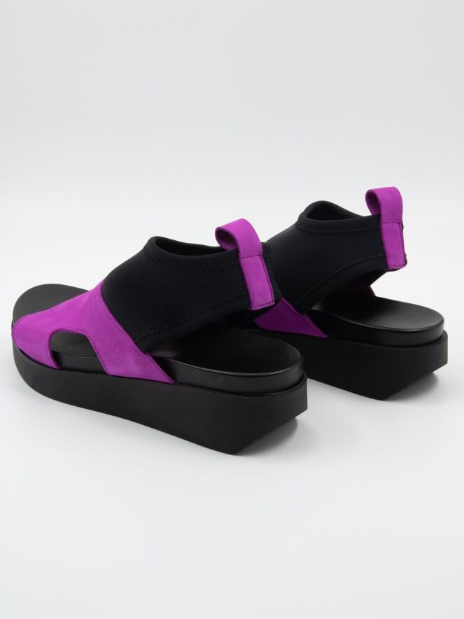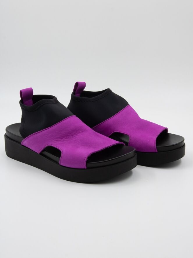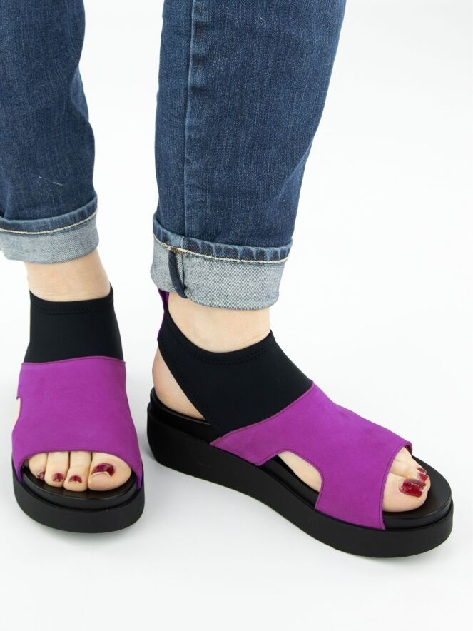 Une sandale d'Arche avec une semelle compensée de couleur violette. De la partie supérieure de l'avant-pied jusqu'à la cheville se trouve un tissu élastique noir.