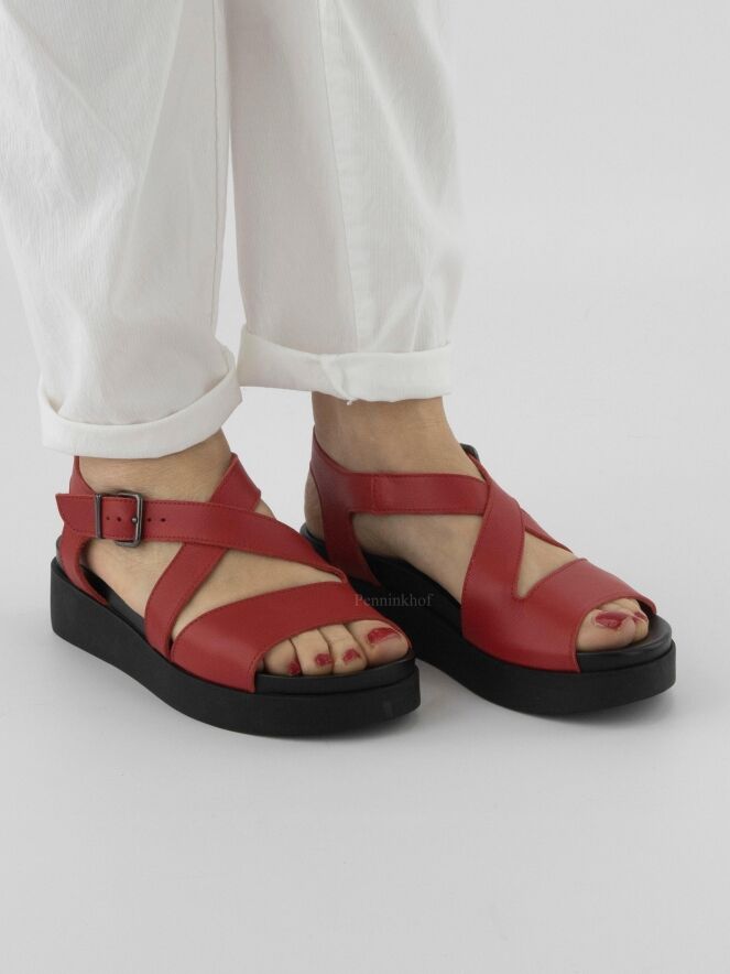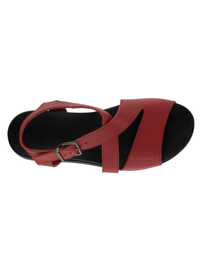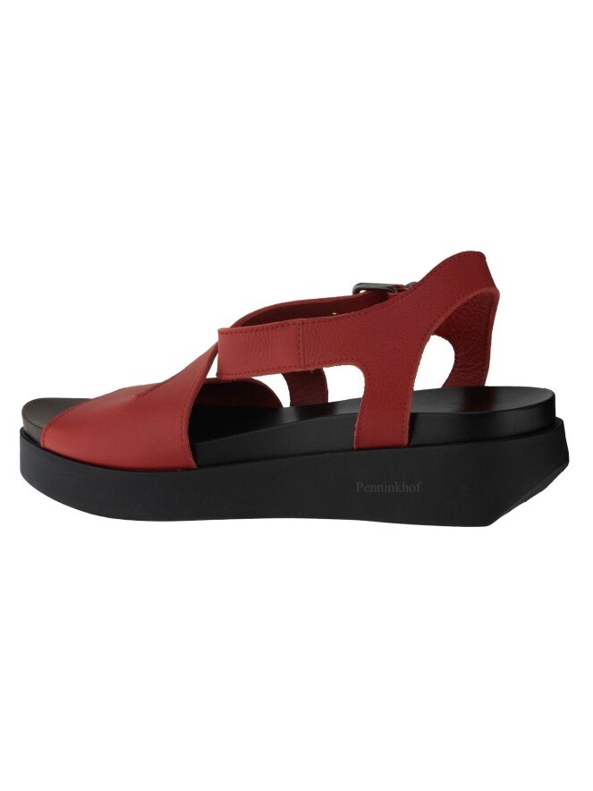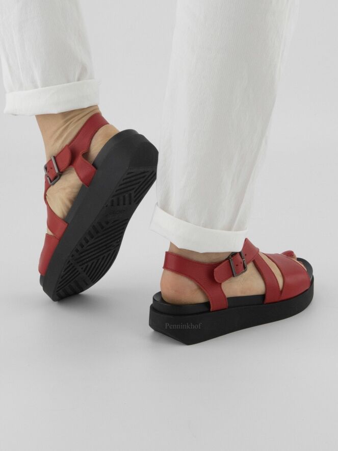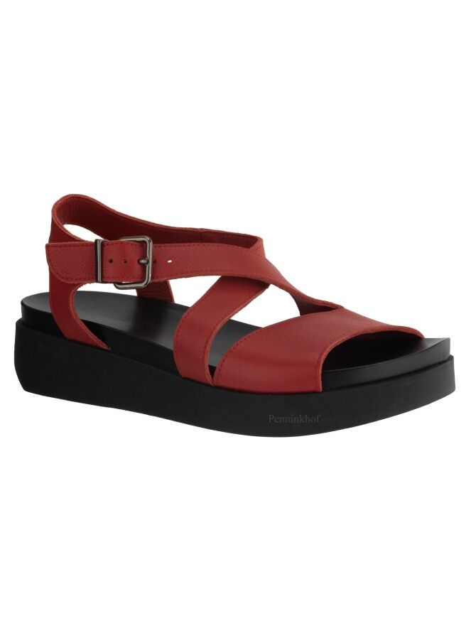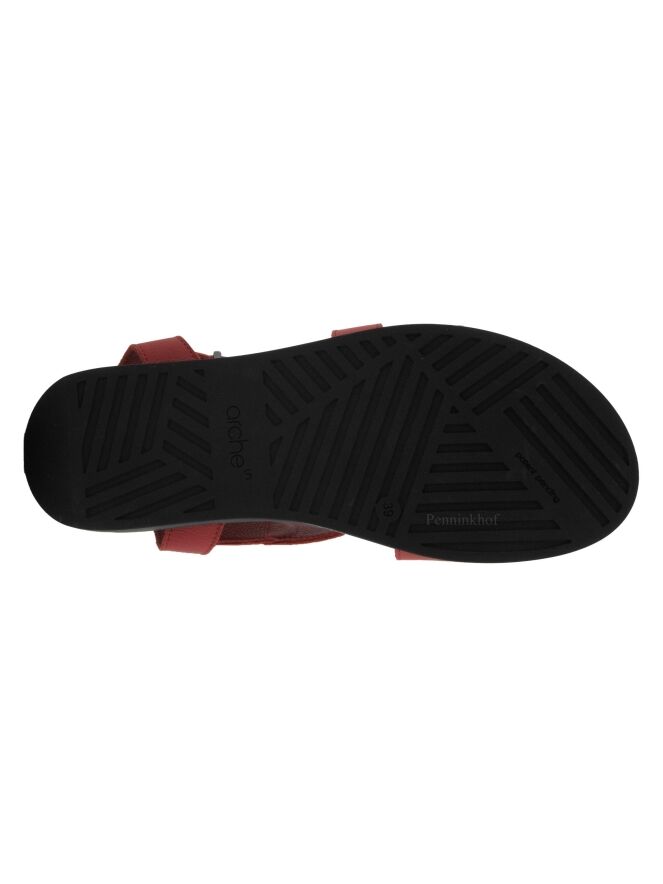 Sandale de la marque Arche, en nubuck de couleur rouge. Deux lanières en cuir se croisent sur le coup du pied. Talon ouvert à sangle réglable.
