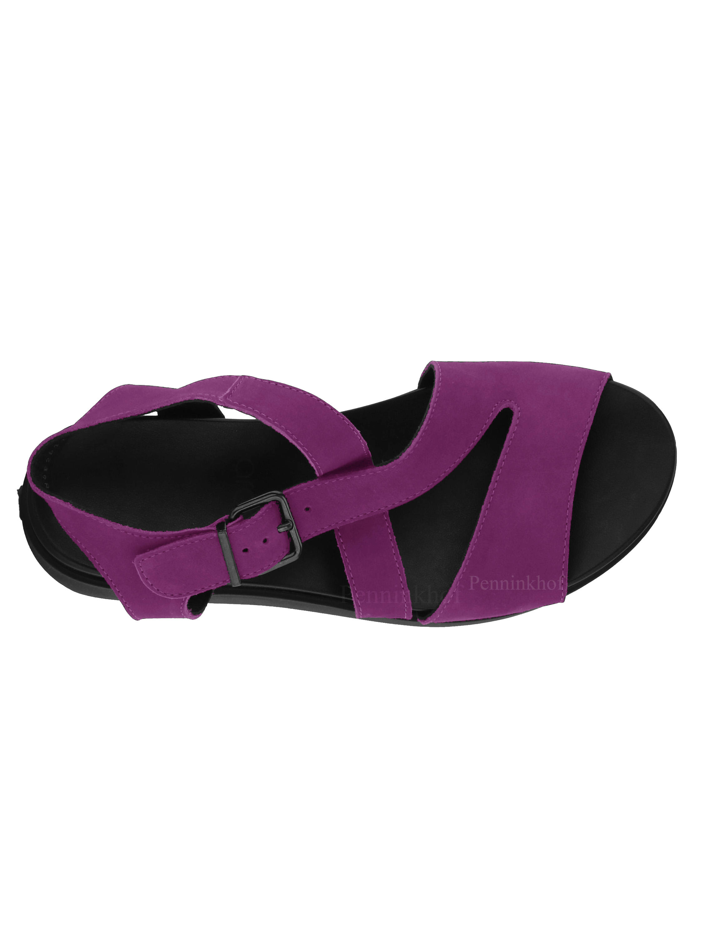 Sandale de la marque Arche, en nubuck de couleur fuchsia. Deux lanières en cuir se croisent sur le coup du pied. Talon ouvert à sangle réglable.