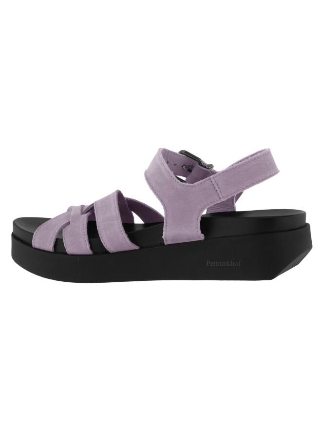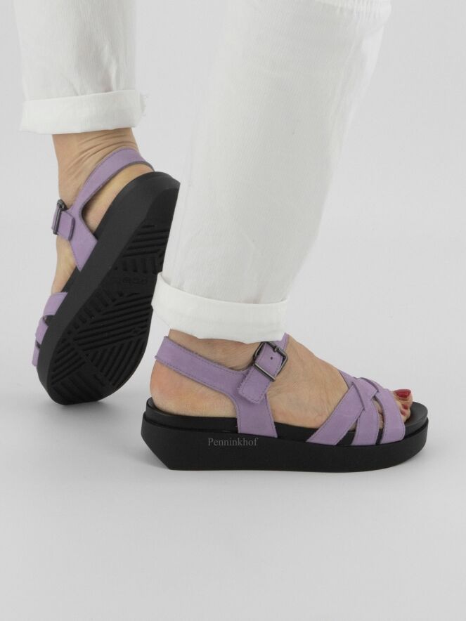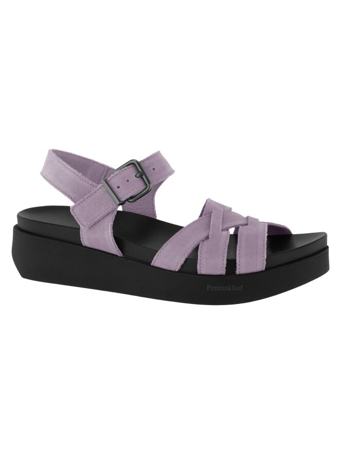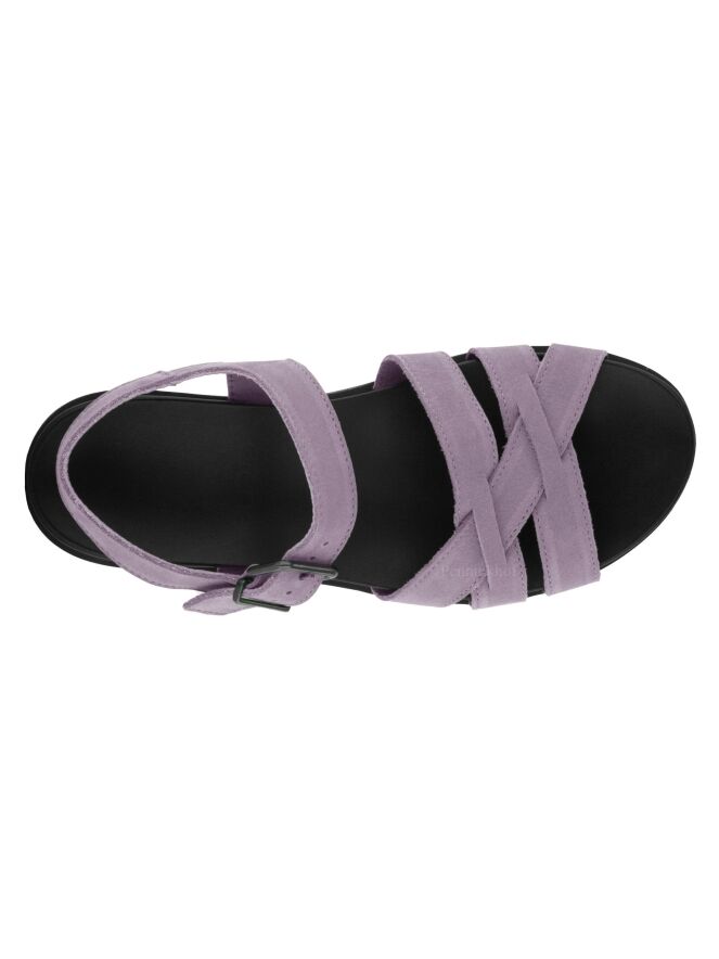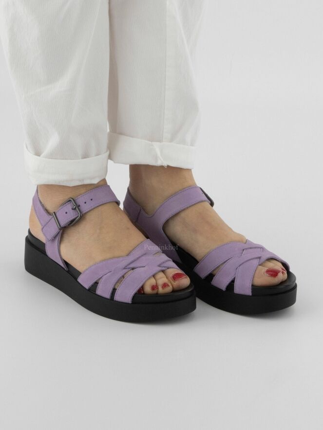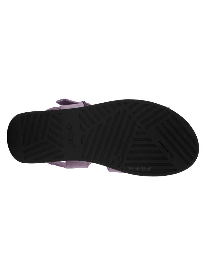 Sandale ouverte de la marque Arche, en nubuck lilas. La sangle autour de la cheville est réglable. Une semelle noire souple est placée sur la semelle en latex. Les 3 sangles sur l'avant-pied s'entrecroisent avec la sangle centrale du milieu du pied. Le talon ouvert est à sangle réglable.