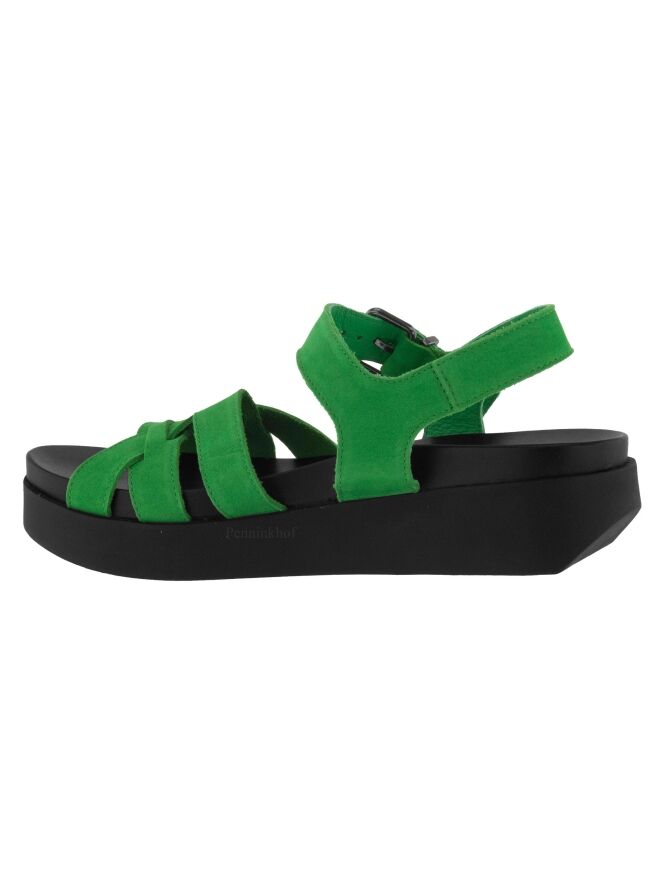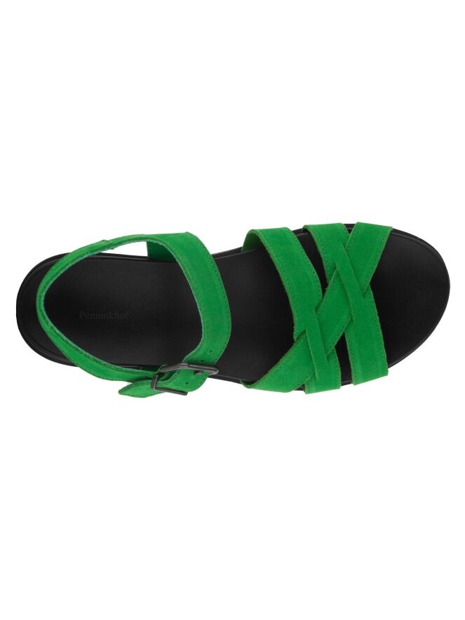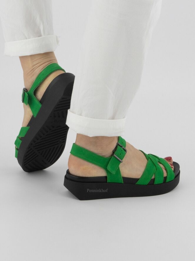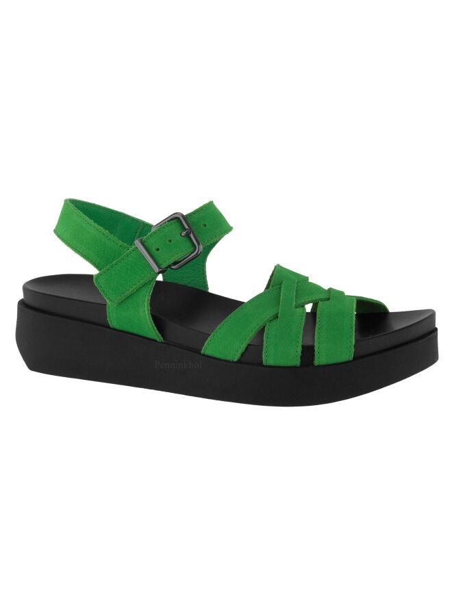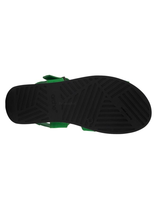 Sandale ouverte de la marque Arche, en nubuck vert. La sangle autour de la cheville est réglable. Une semelle noire souple est placée sur la semelle en latex. Les 3 sangles sur l'avant-pied s'entrecroisent avec la sangle centrale du milieu du pied. Le talon ouvert est à sangle réglable.