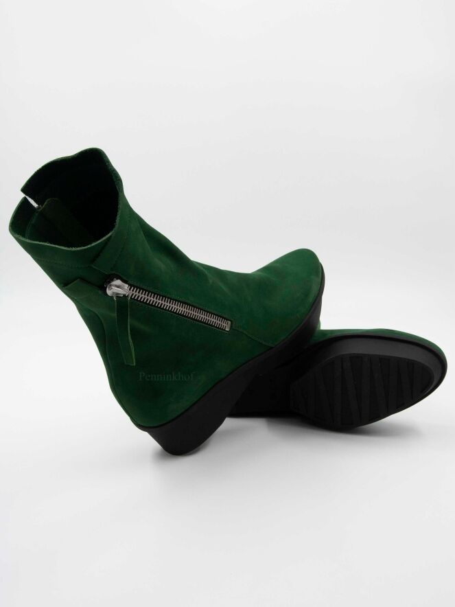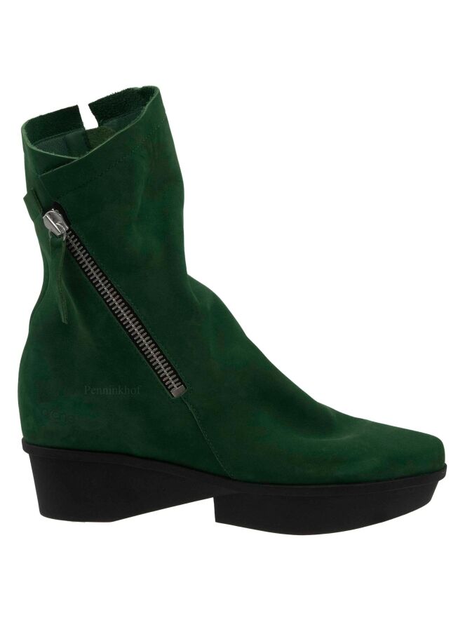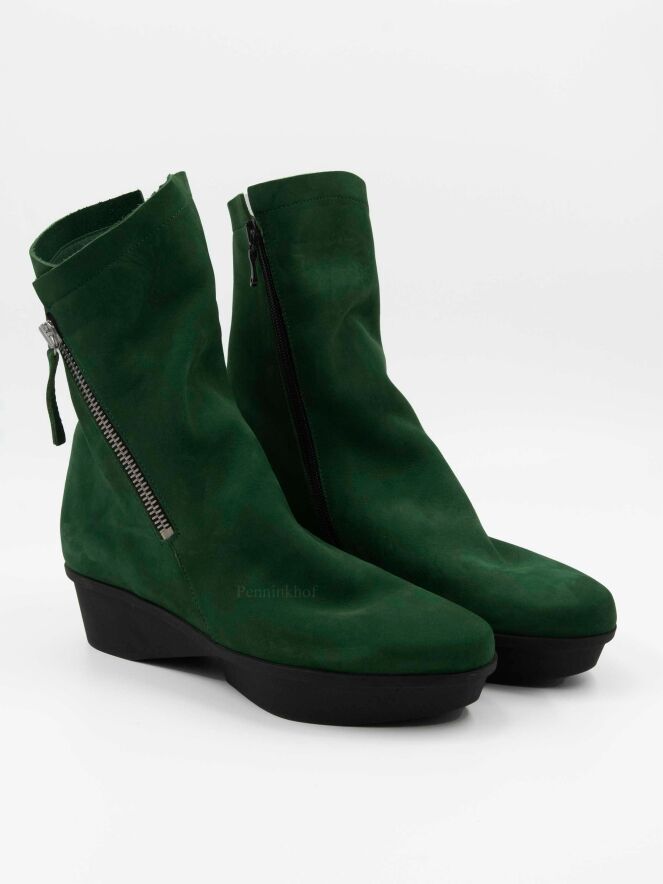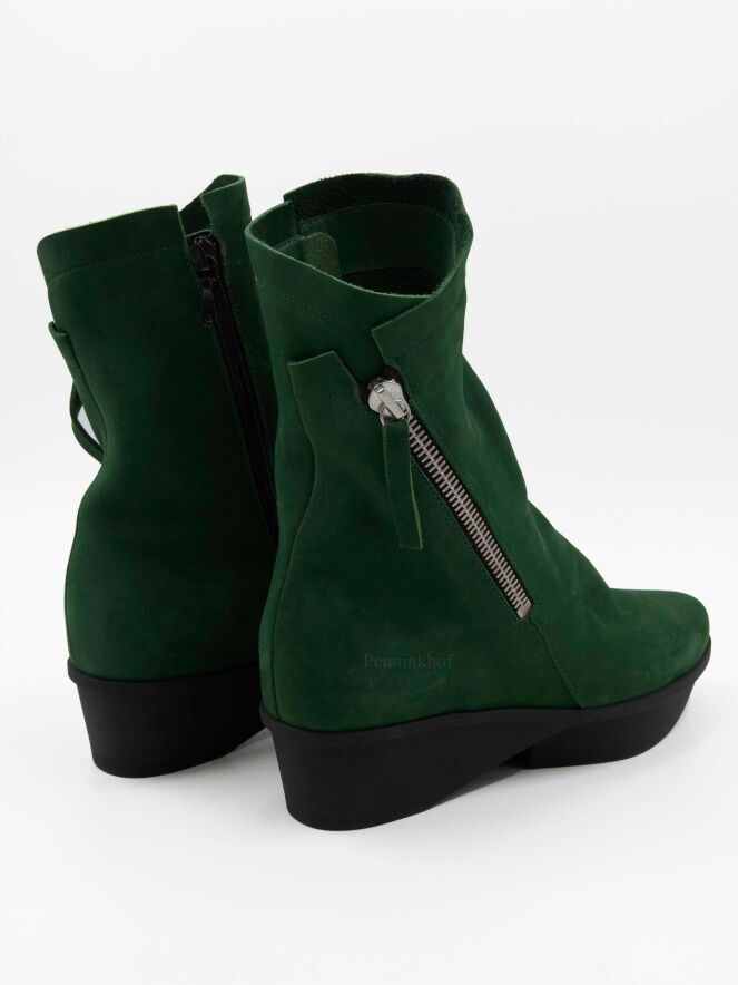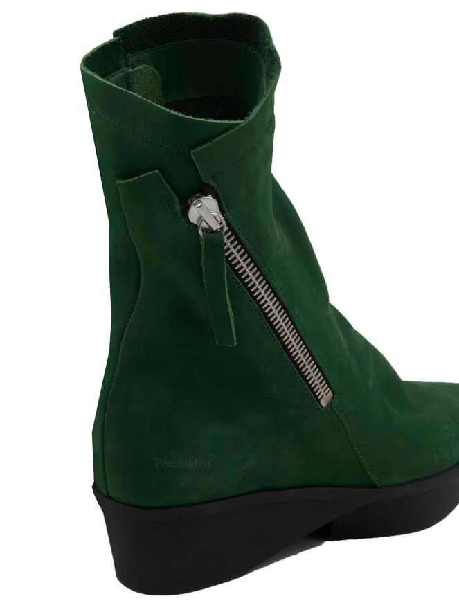 Une bottine de Arche en vert. La botte a un nez fin et sur l'extérieur de la tige se trouve une fermeture éclair décorative de couleur argentée. A l'intérieur se trouve une fermeture éclair noire. La semelle de créateur est dotée d'une plateforme à l'avant-pied et au talon. L'intérieur n'est pas doublé.