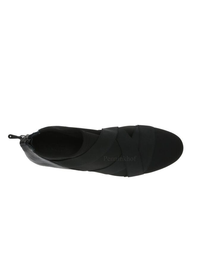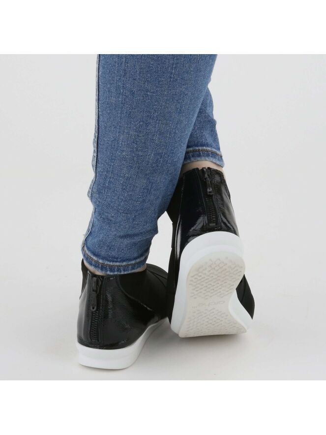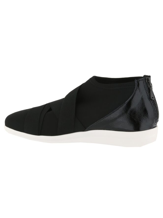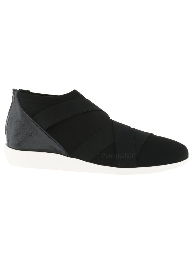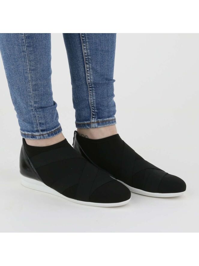 Sneaker de la marque Arche, en tissu noir élastique avec une bordure élastique noire en diagonale sur le cou-de-pied. Un empiècement de cuir noir, partagé au centre par un zip de fermeture, entoure le talon. La semelle latex est de couleur blanche.