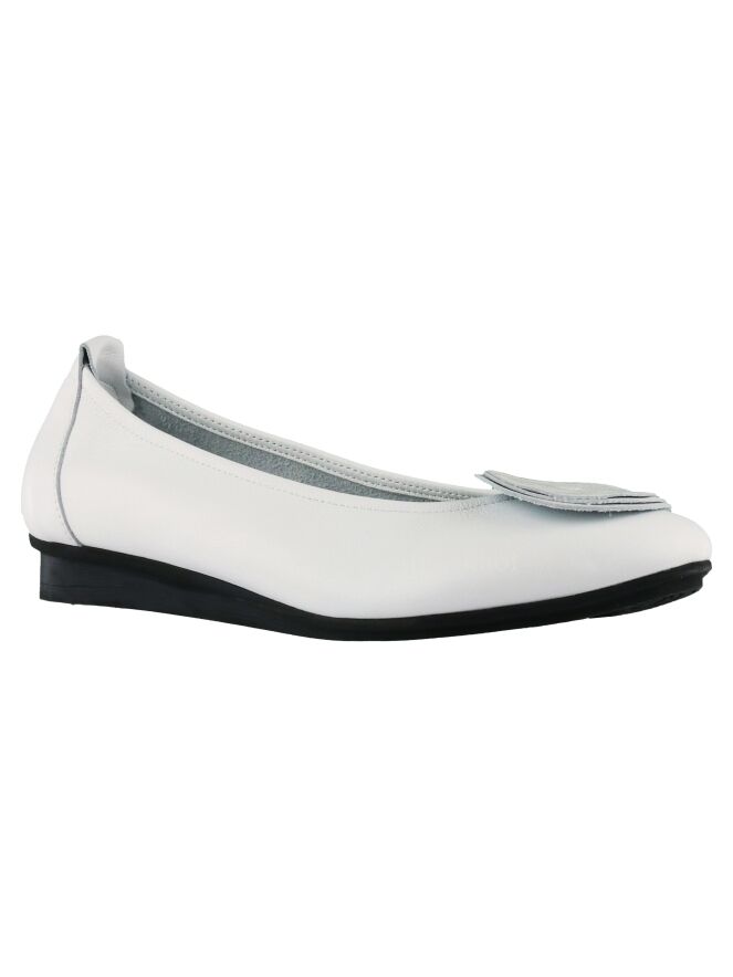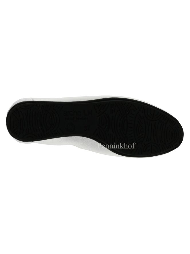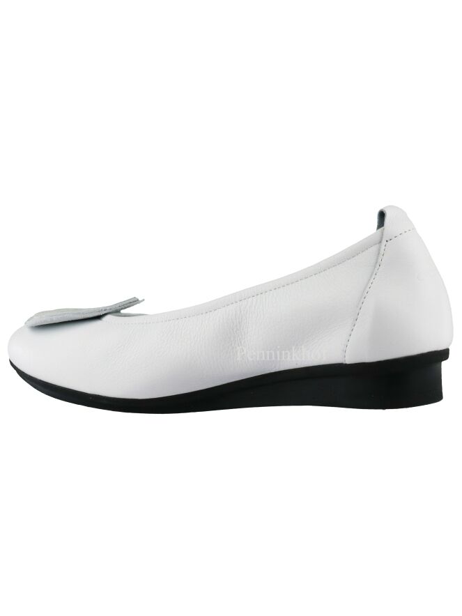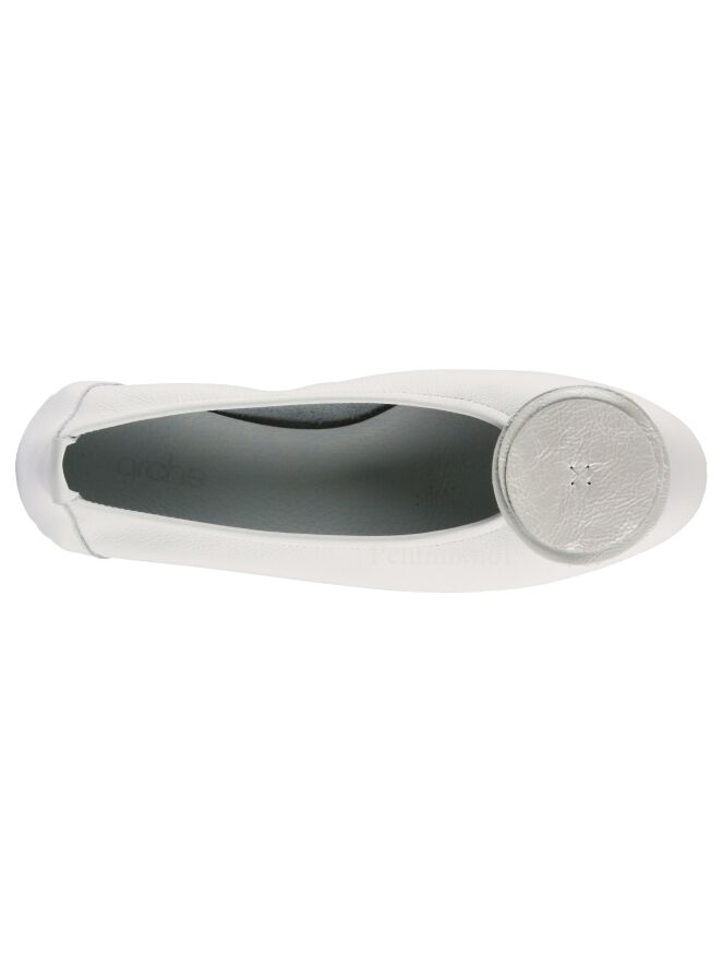Ballerine de la marque Arche, de couleur blanche. Une rondelle en cuir légérement laquée de même couleur, orne l'avant pied en 3 couches. L'intérieur de la chaussure n’est pas doublé. La semelle très légèrement rehaussée au niveau du talon.