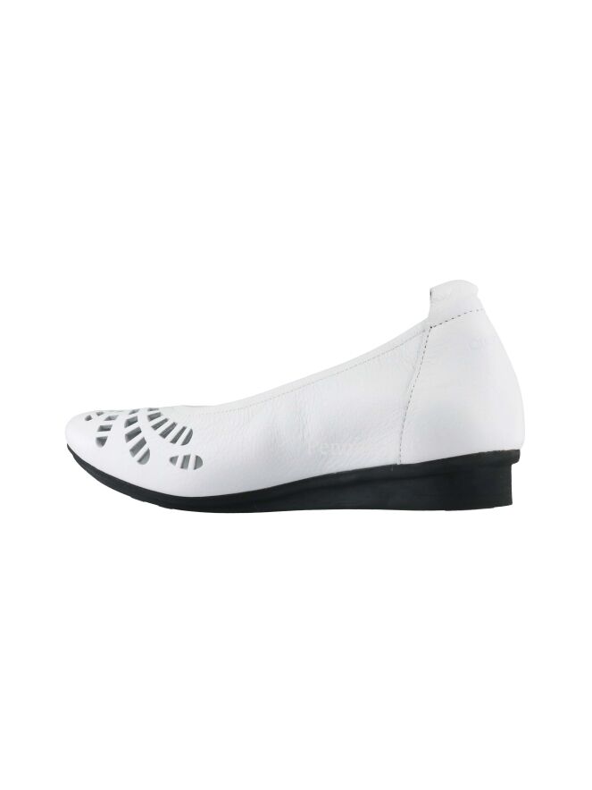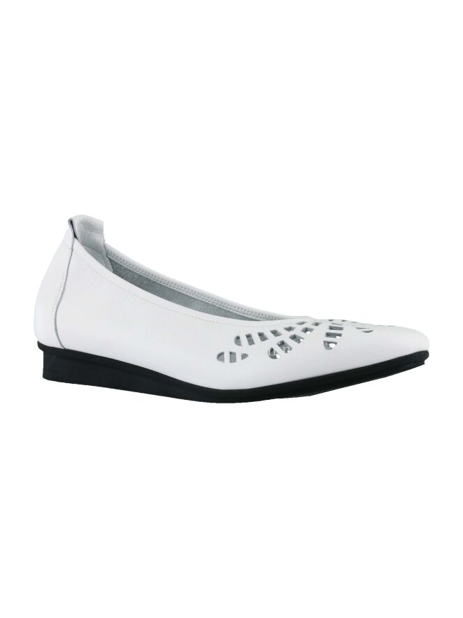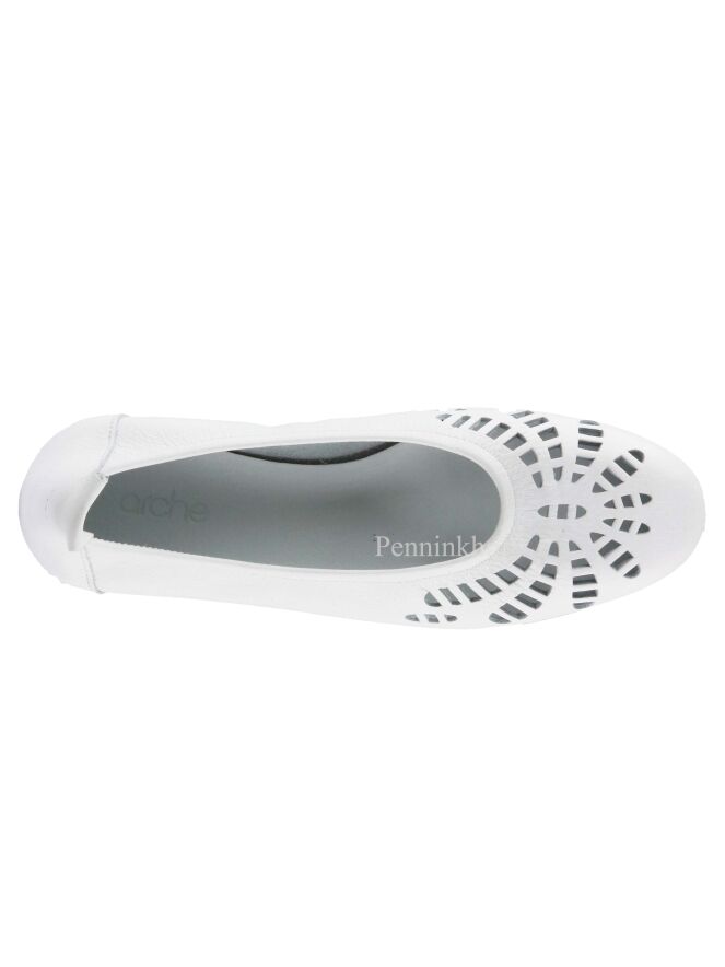 Ballerine de la marque Arche, en nubuck de couleur blanche. L'avant du pied est ajouré en forme de fleur. La semelle est de couleur noire. L'intérieur de la ballerine n'est pas doublé.
