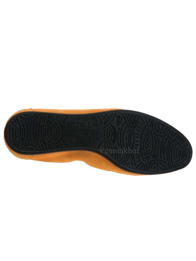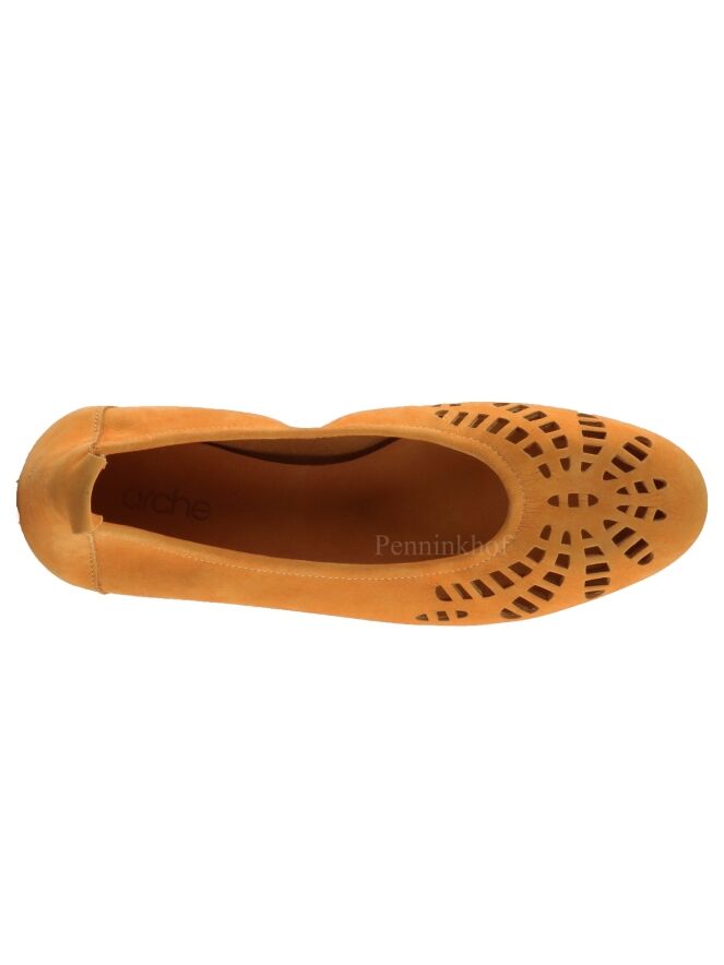 Ballerine de la marque Arche, en nubuck de couleur orange. L'avant du pied est ajouré en forme de fleur. La semelle est de couleur noire. L'intérieur de la ballerine n'est pas doublé.