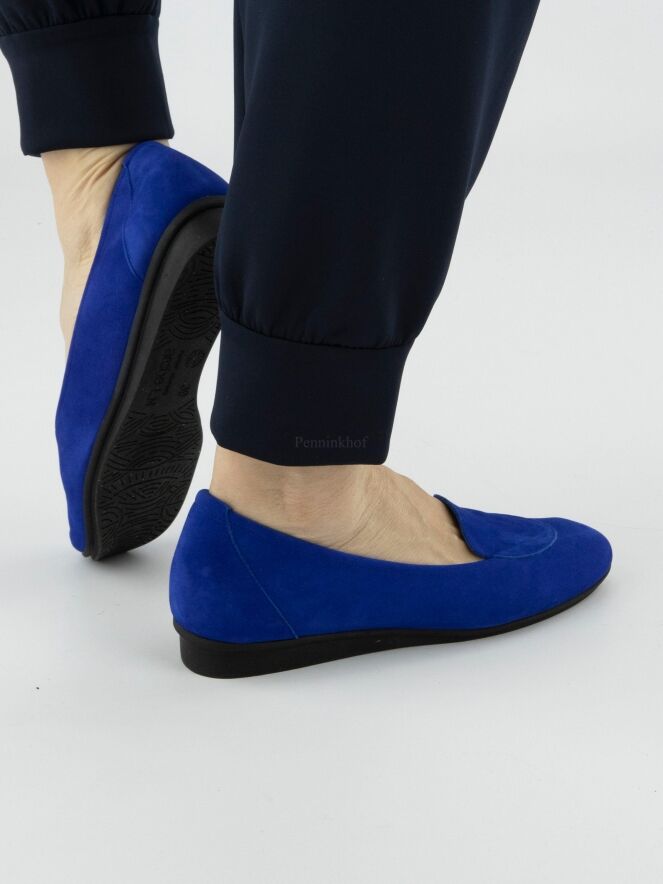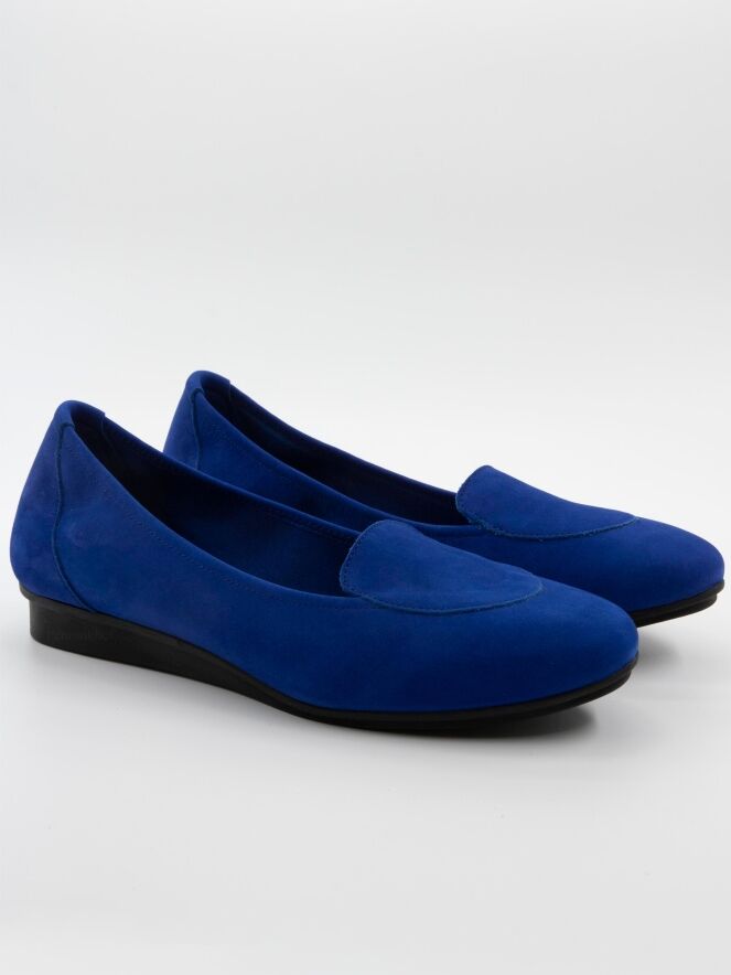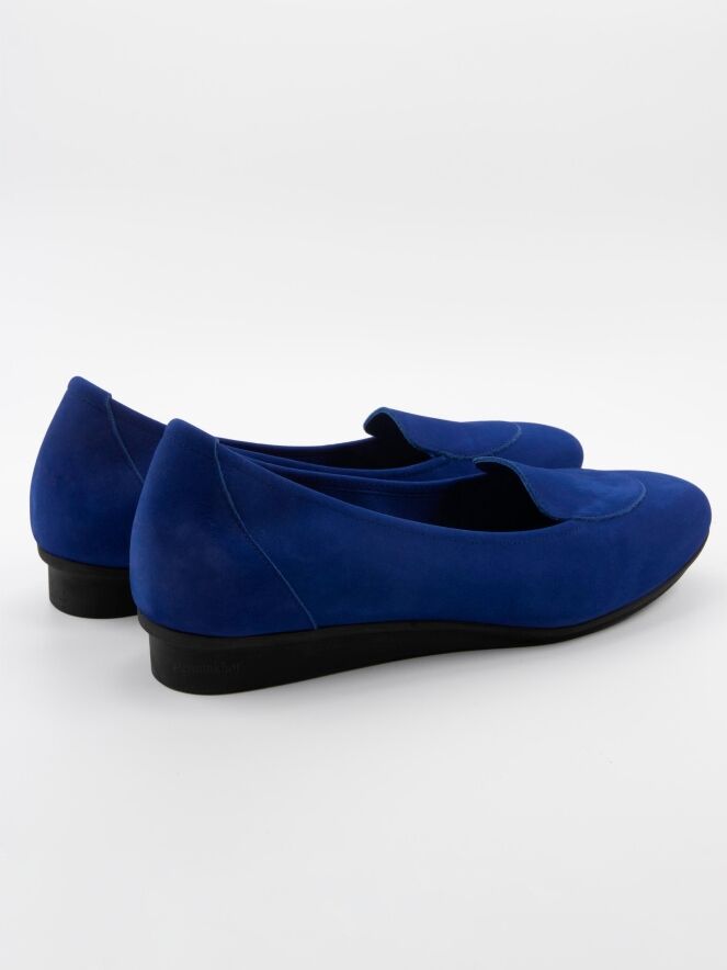 Une Chaussures plates en bleu cobalt avec une semelle surélevée au niveau du talon. L'intérieur n'est pas doublé.