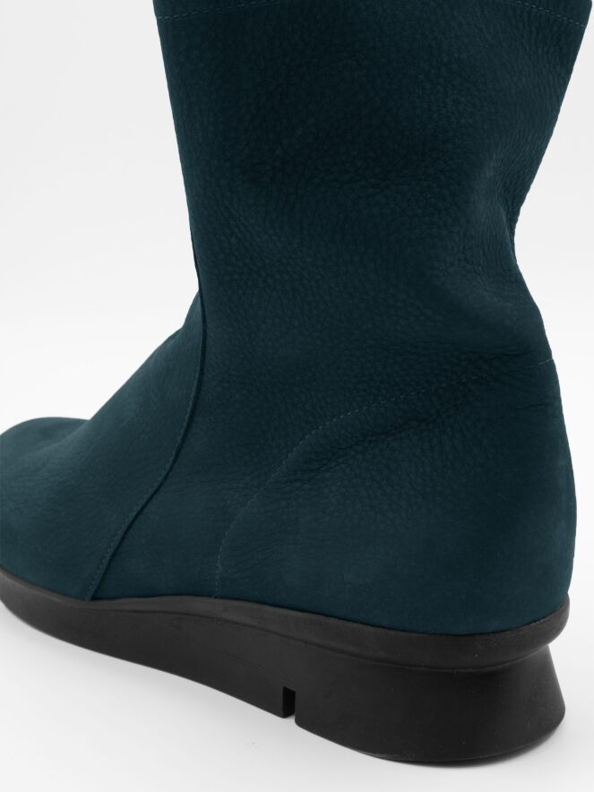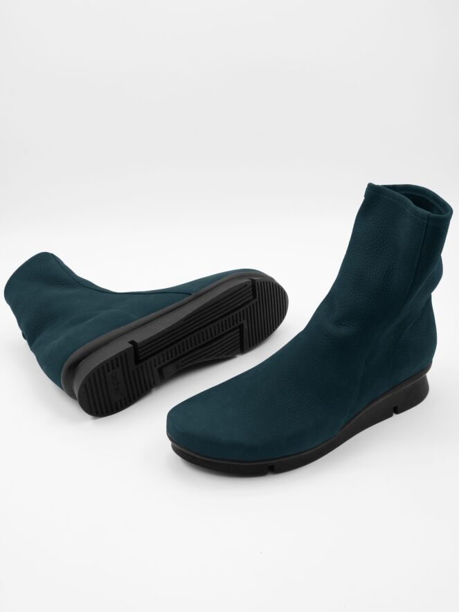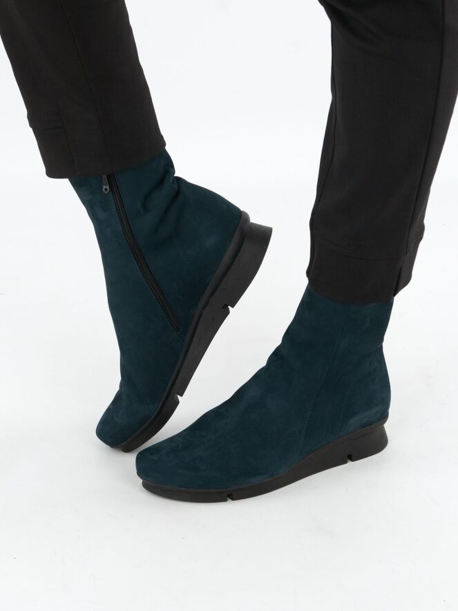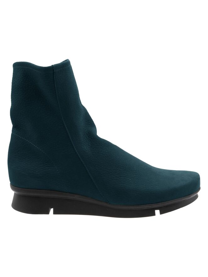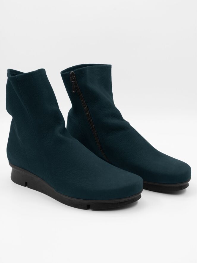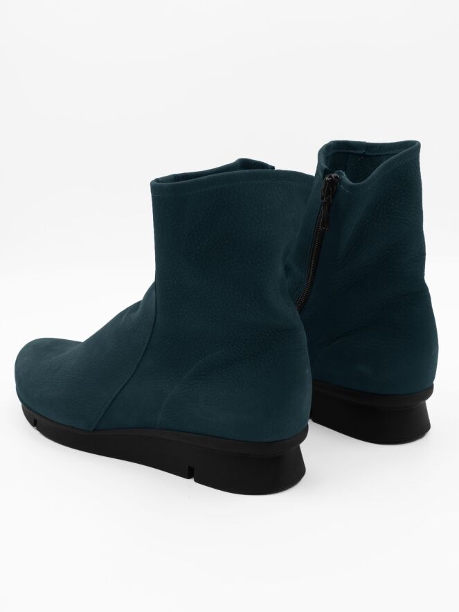 Une bottine Arche de couleur bleu pétrole. La botte a une semelle sportive en latex légèrement surélevée de couleur noire. A l'intérieur se trouve une fermeture éclair noire. Le nez de la botte est arrondi et l'intérieur n'est pas doublé.