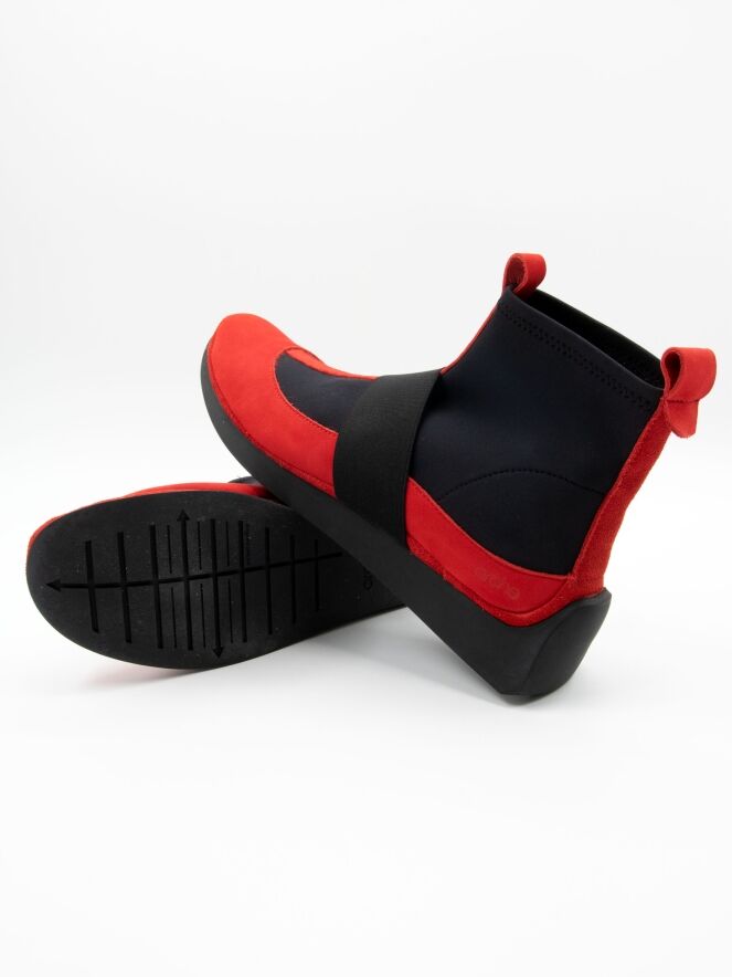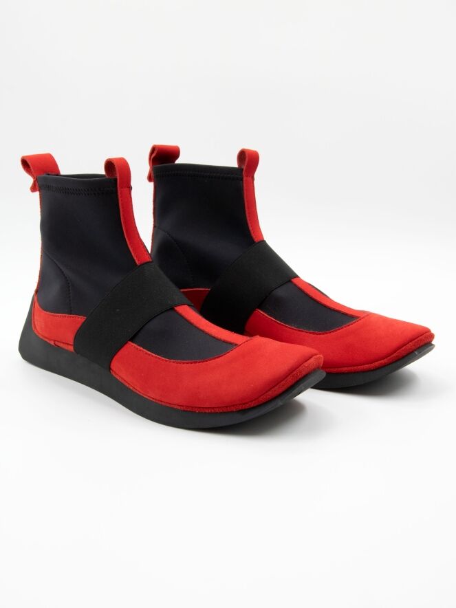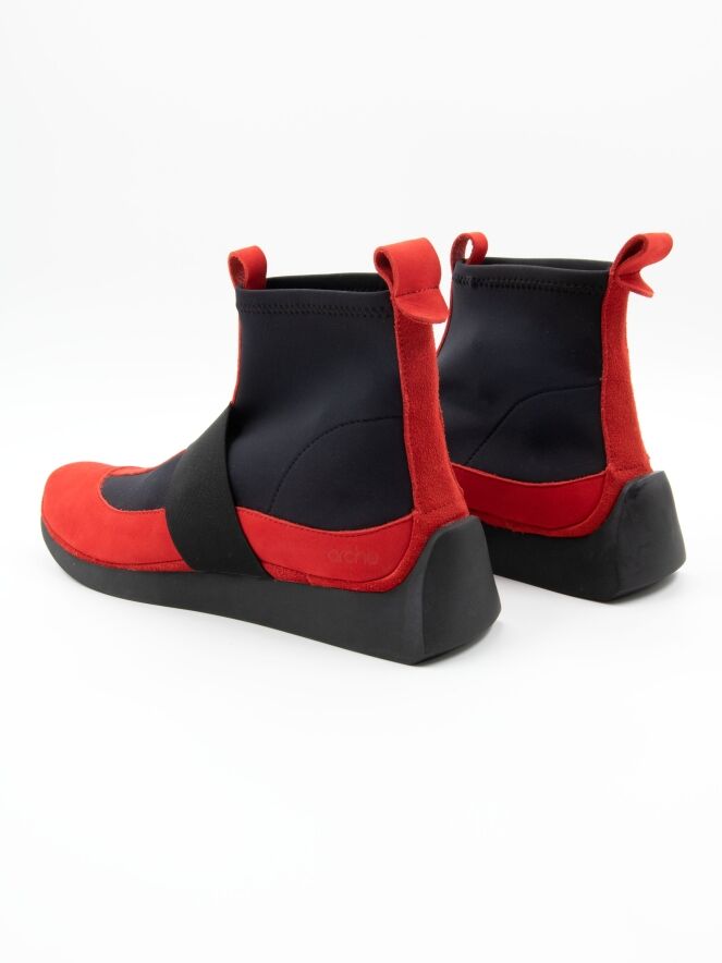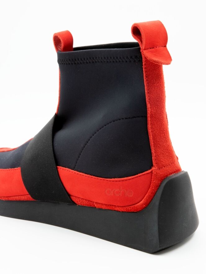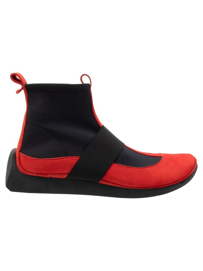 Une bottine courte de la marque Arche dans un rouge intense. Des empiècements élastiques noirs partent des côtés de l’avant-pied jusqu’à la tige. Un liseré en nubuck orne le talon. Une large bande élastique traverse l’avant-pied. L’intérieur de la bottine est non doublé.