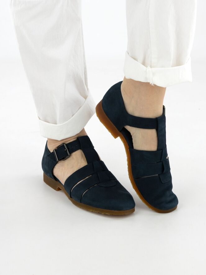 Sandale de Arche dans une élégante teinte bleu marine. Dotée d’un bout et d’un talon fermés, elle offre un maintien confortable et sécurisé. La bride sur l’avant du pied est réglable par une boucle pour un ajustement précis. La semelle couleur miel apporte un contraste chaleureux et raffiné au modèle.