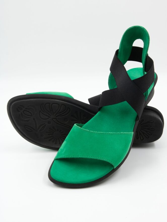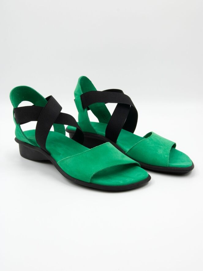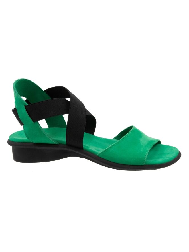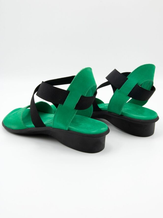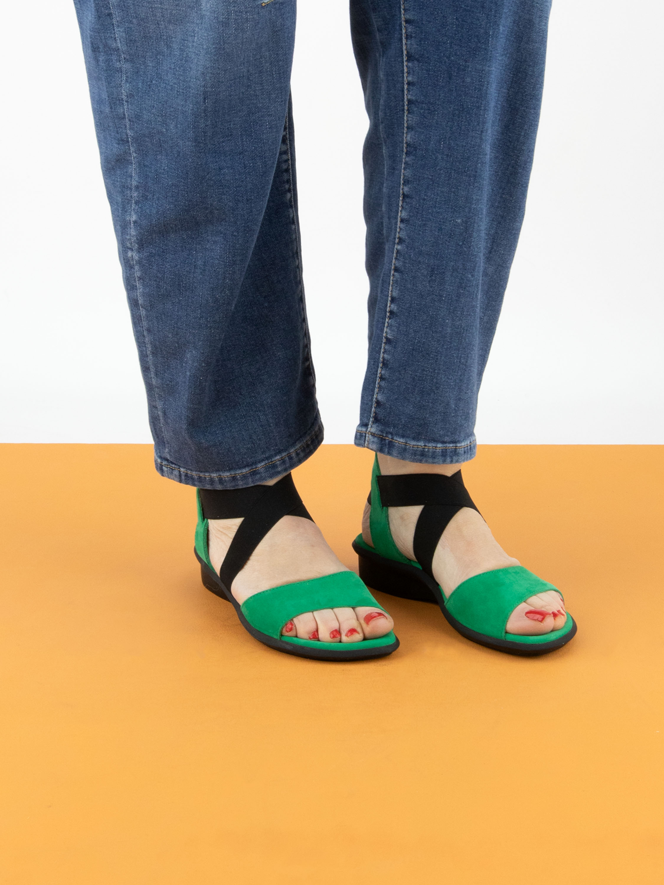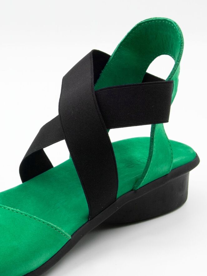 Une sandale ouverte de Arche en vert. Une bride traverse l’avant-pied. Depuis l’arrière du talon, une bande élastique noire croisée s’étend jusqu’aux côtés de la sandale.