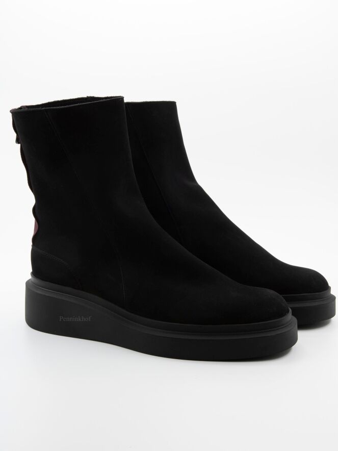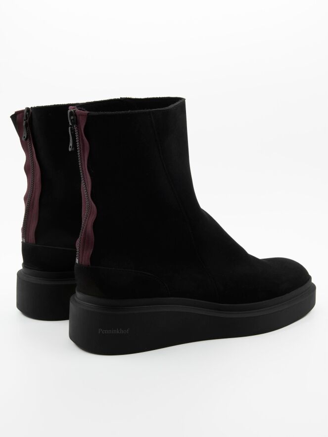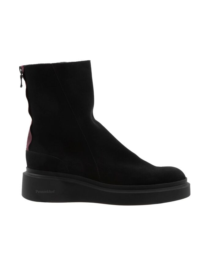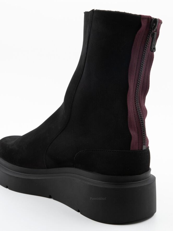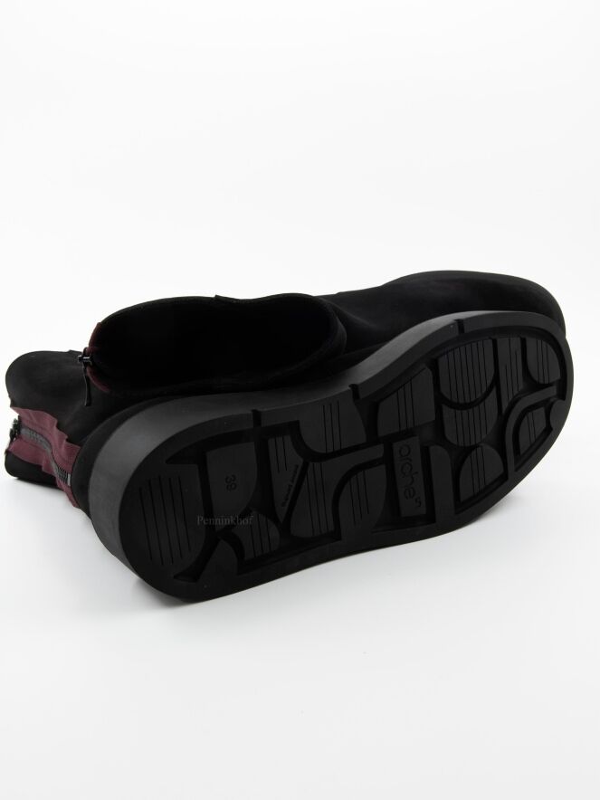 Une bottine courte de la marque Arche, de couleur noire. La botte a un bout arrondi et sur le talon se trouve une fermeture éclair avec des passepoils de couleur aubergine des deux côtés. L'intérieur de la botte n'est pas doublé.